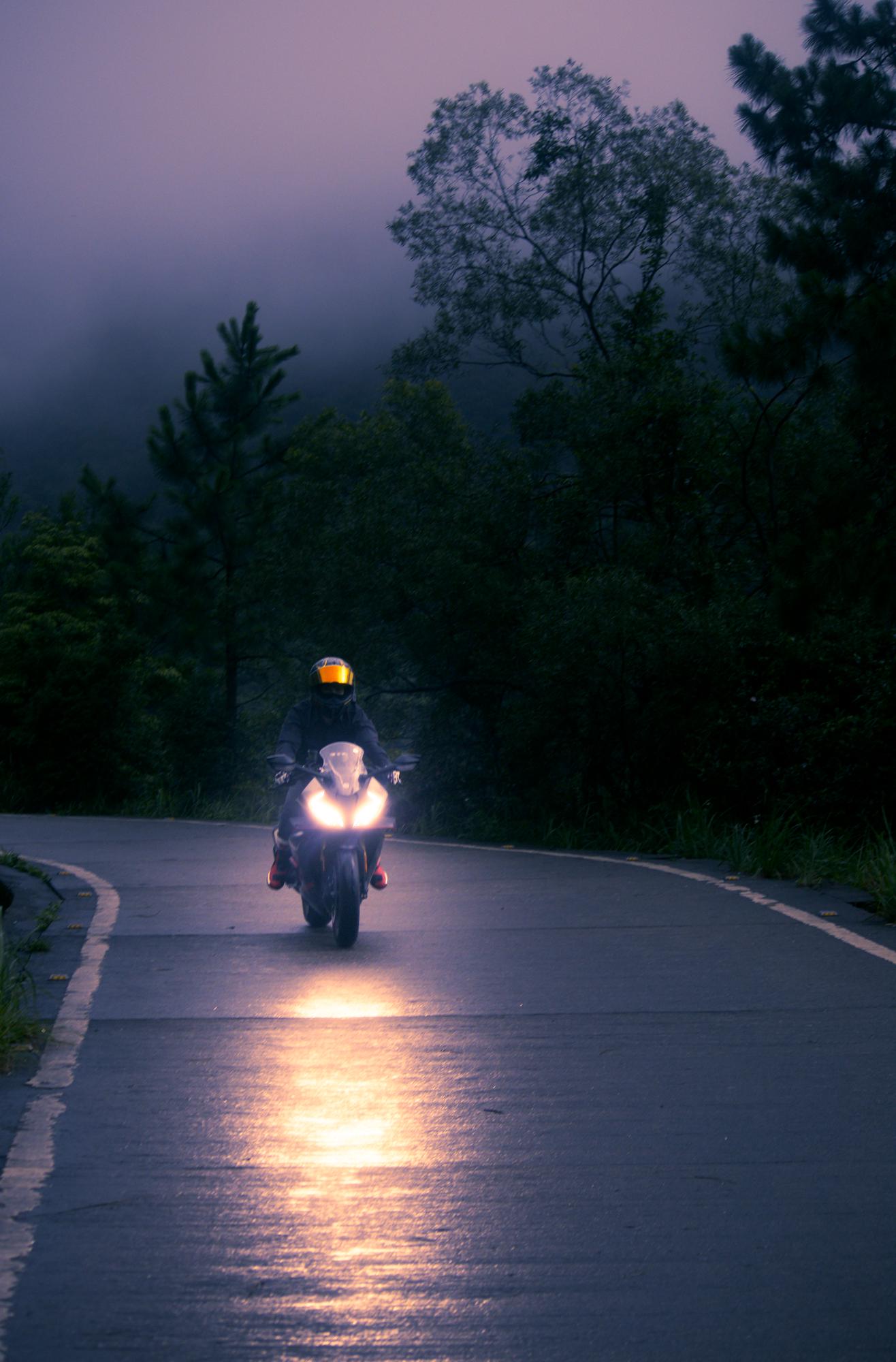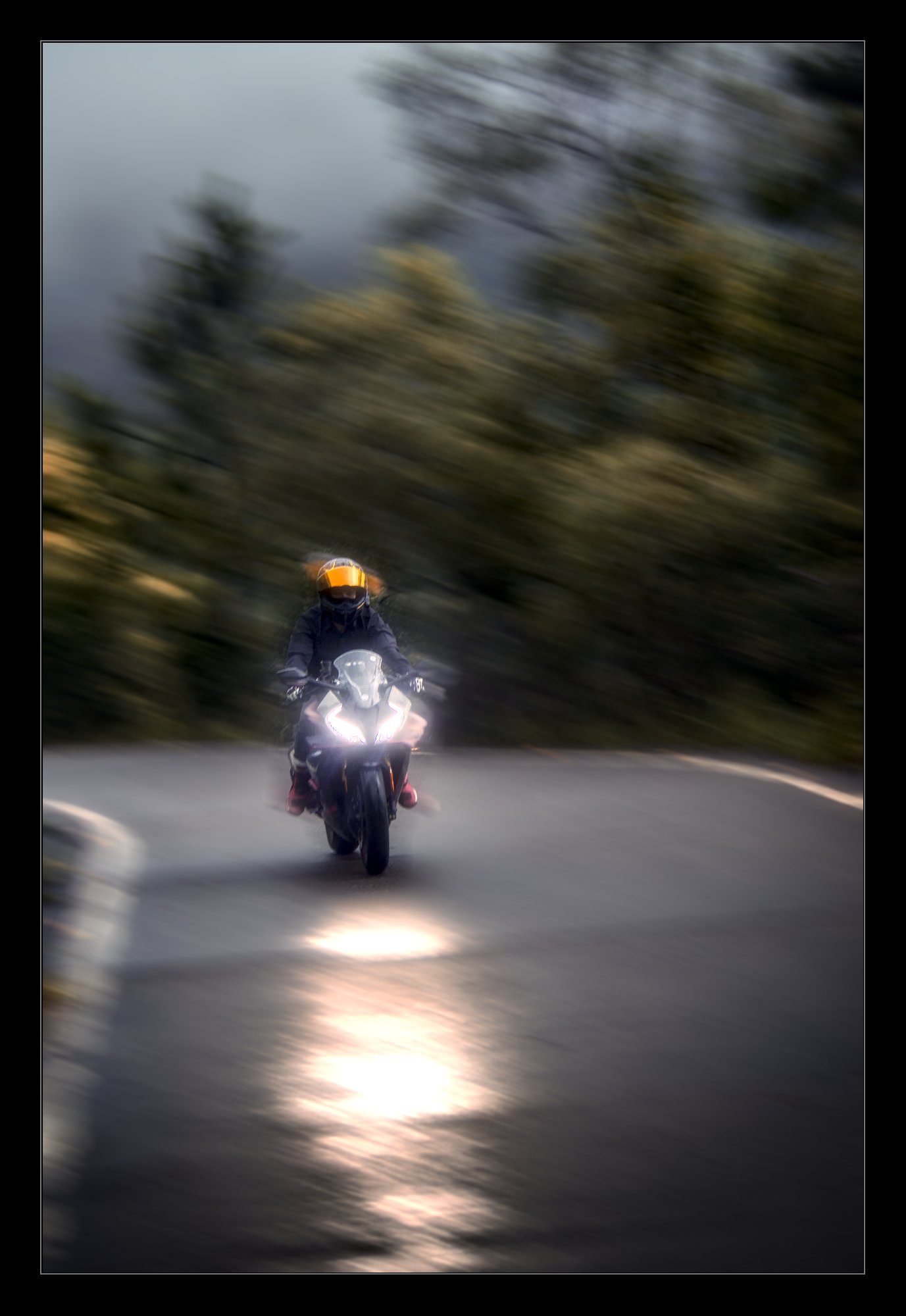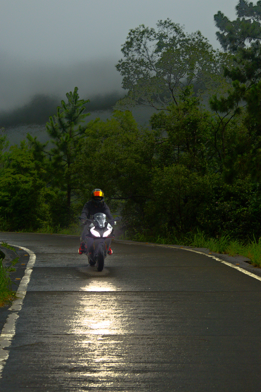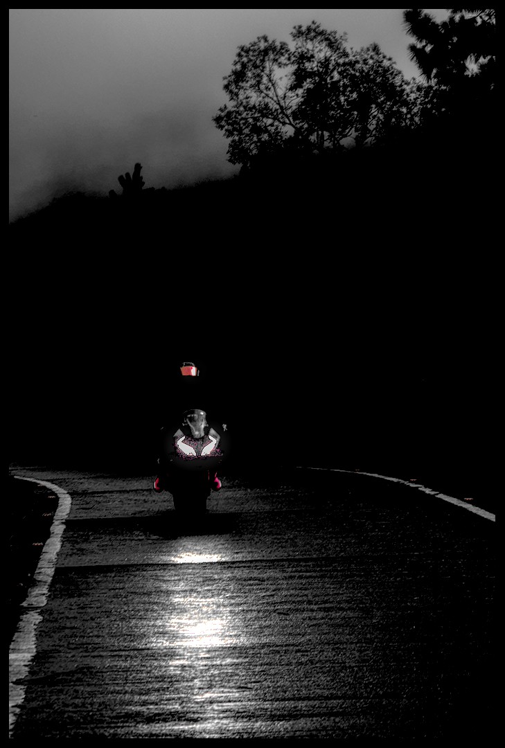 Accentuated the reflection of the headlight on the road and darkened the road surface. Increased saturation on the visor and the boots.
