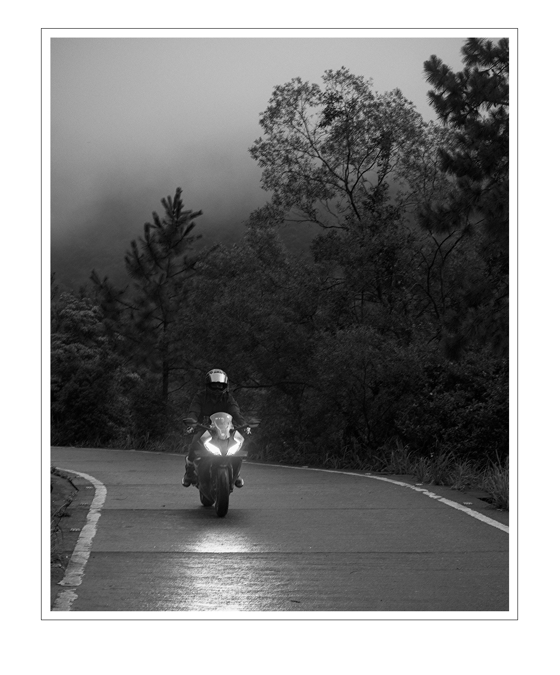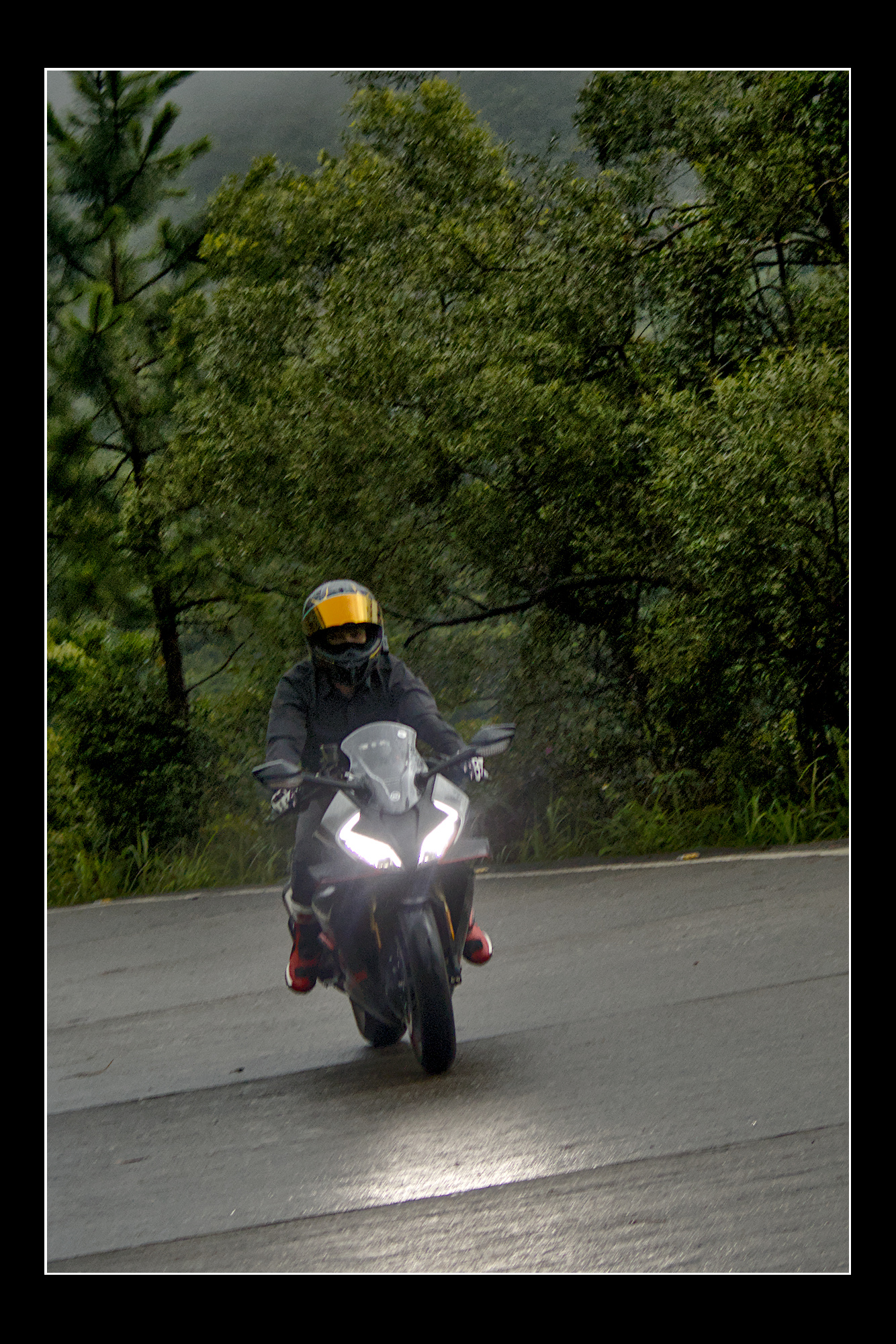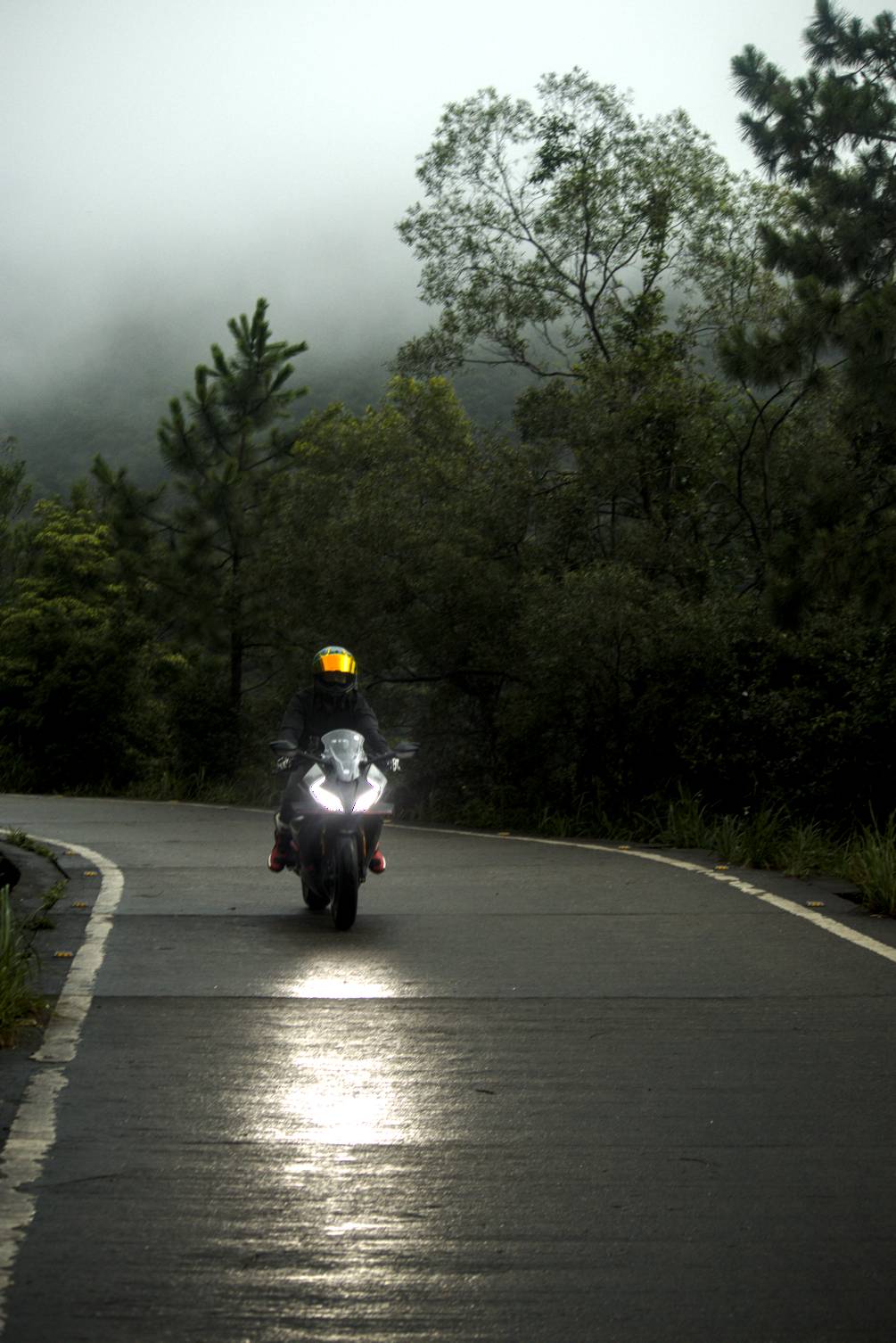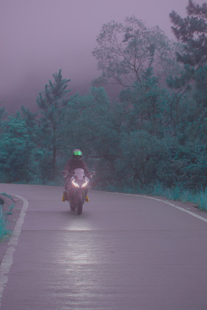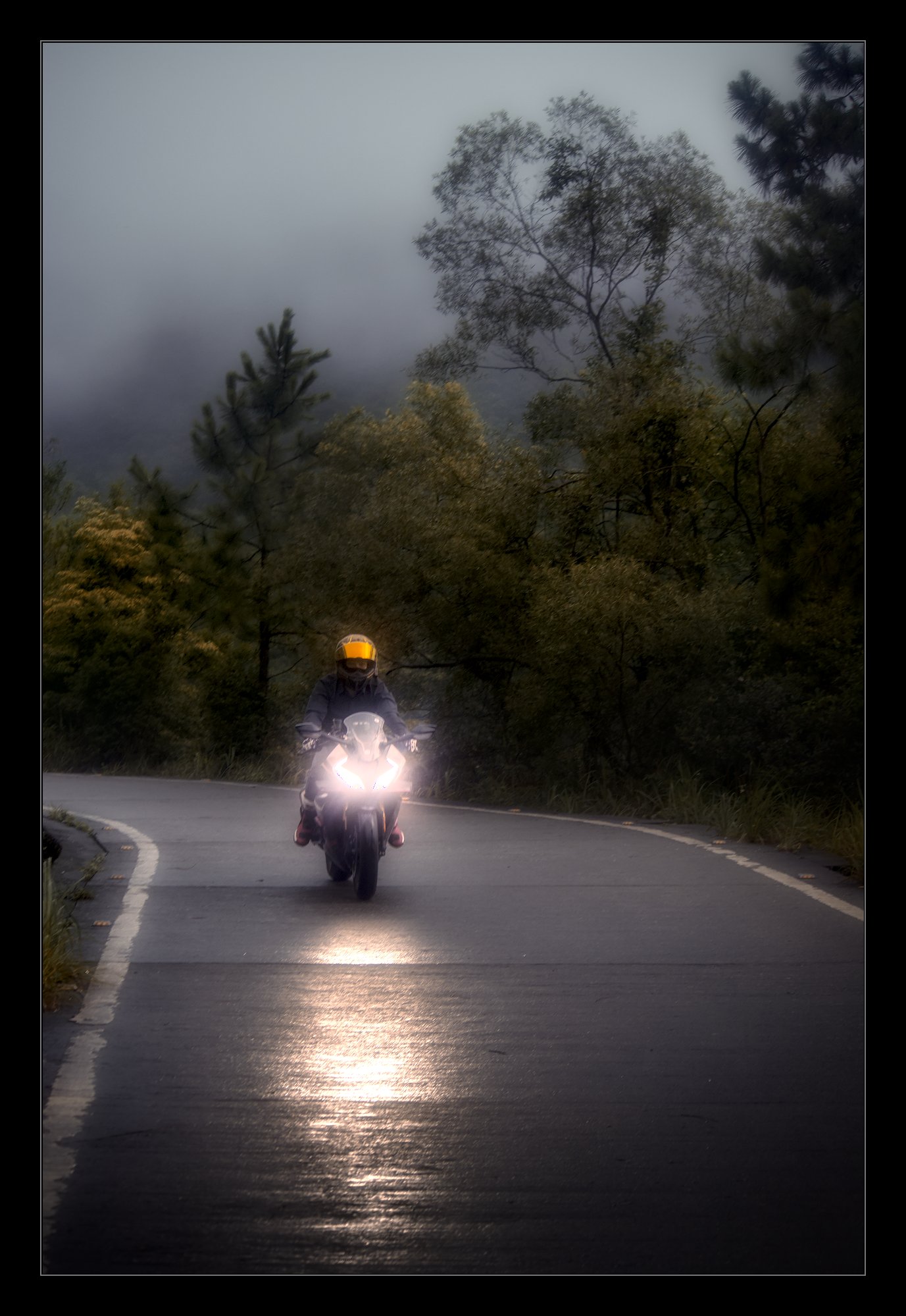 Accentuated the reflection of the headlight on the road and darkened the road surface. Increased saturation on the visor and the boots.