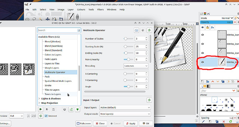 Never going to work with Gimp 3 but try the gimp_gmic_qt plugin www.gmic.eu which has the multi-scale filter. Starting with a 256x256 icon you can get 128 / 96 / 64 sizes.