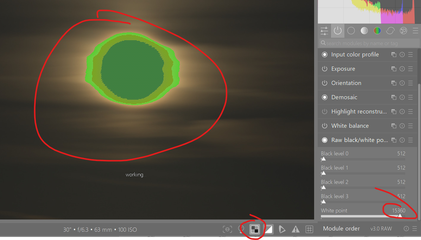But, to show the ‘problem’: Disable everything that you can disable, except for ‘white balance’, ‘orientation’, ‘exposure’ and ‘color calibration’ (if it’s enabled). Particulary: Disable ‘highlight reconstruction’ and ‘disable filmic’. Now you get a more ‘raw view’ of your whitebalanced data.