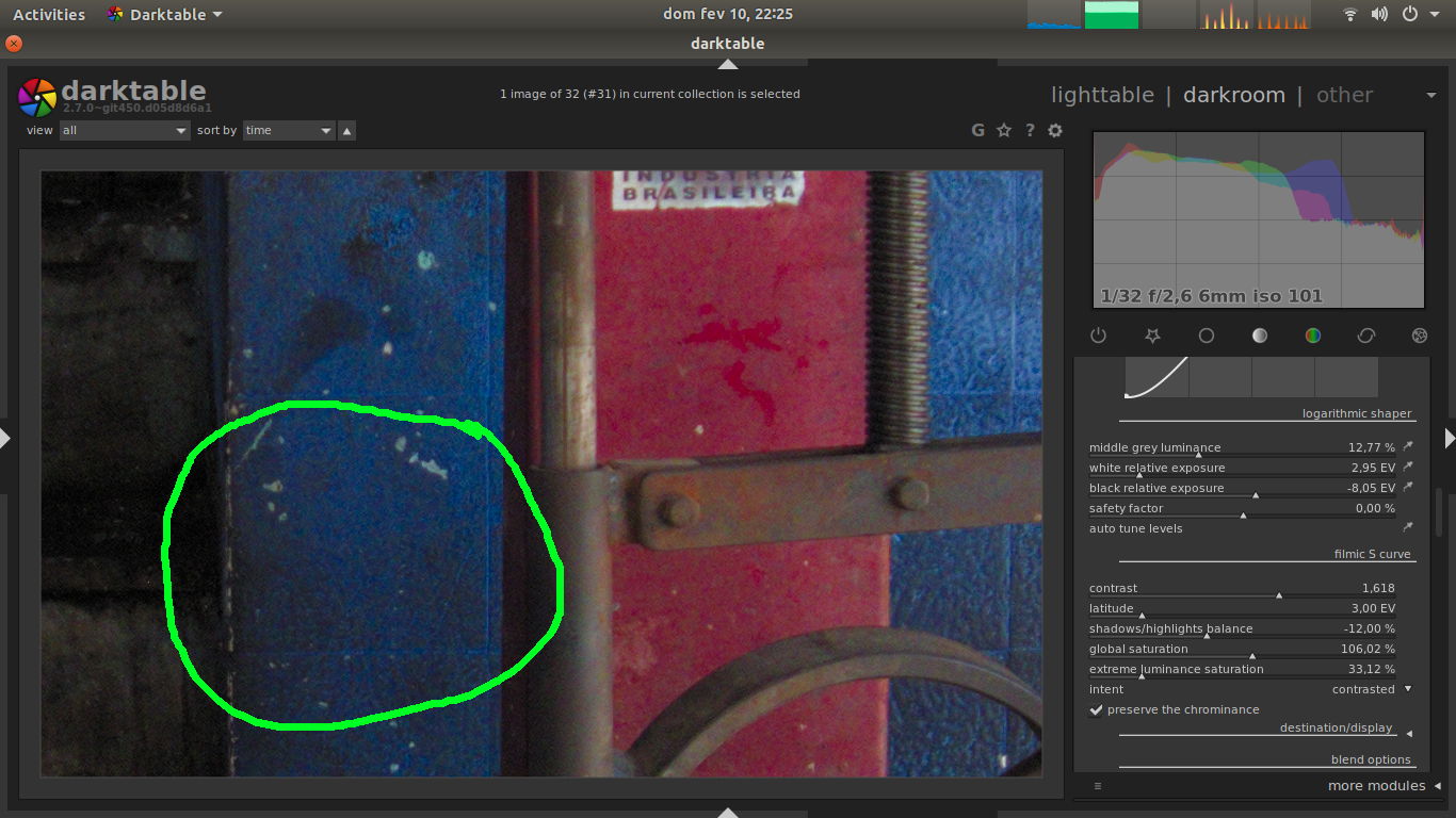 The comparison is between Darktableās filmic and linear+log tm (I tested with all other tone mapping curves and the result is the same - regarding the dust layer), and Photoflow seems to desaturate it more than Darktable, specially on the region marked by the green circle.