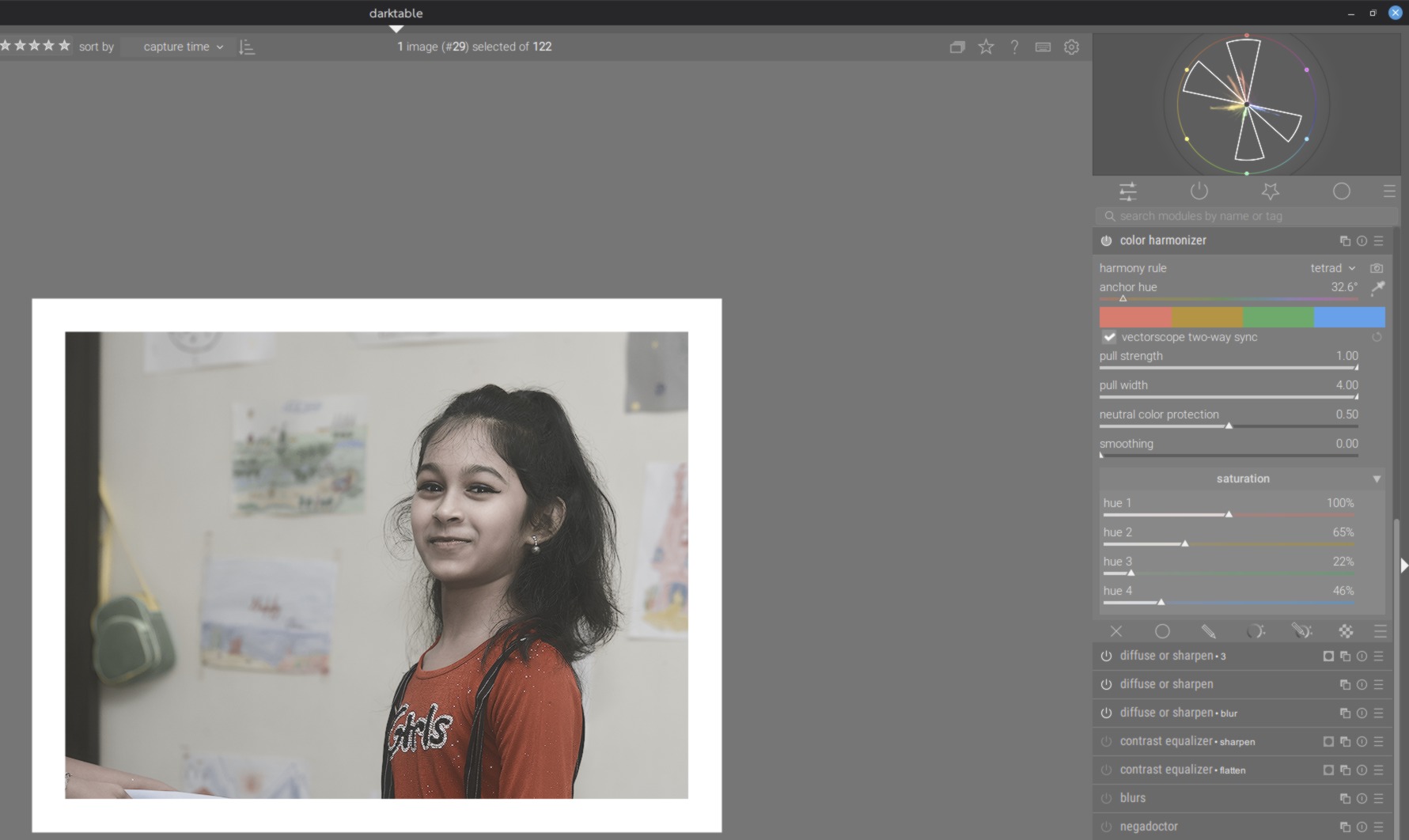 I select ātetradā harmony, with the goal of keeping the orange (skin tones) and red (shirt) in place, but you can see the orange has shifted towards red, instead of staying where it was within the harmony guides.