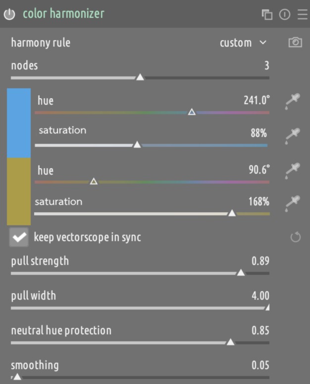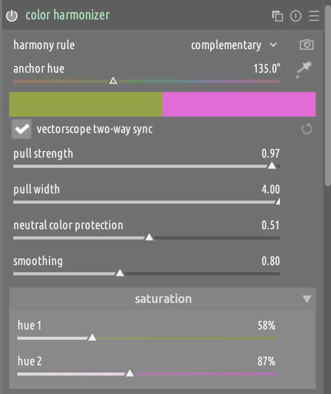 I had explored the double sliders per swatch concept, but I find it more cumbersome, and I like that the current UI provides some process guidance, i.e., first find a harmony that makes sense for your image, and then play with the saturation to fine tune the effect.