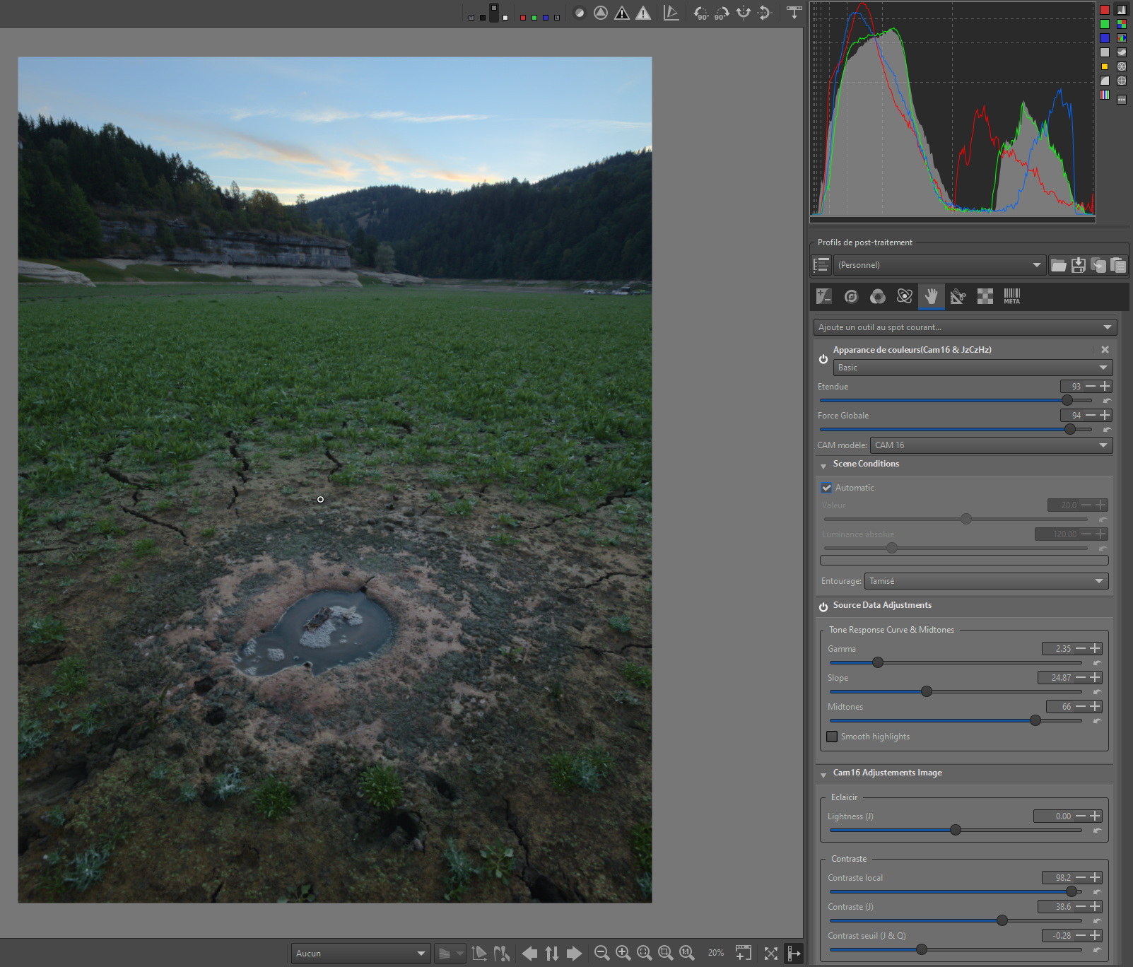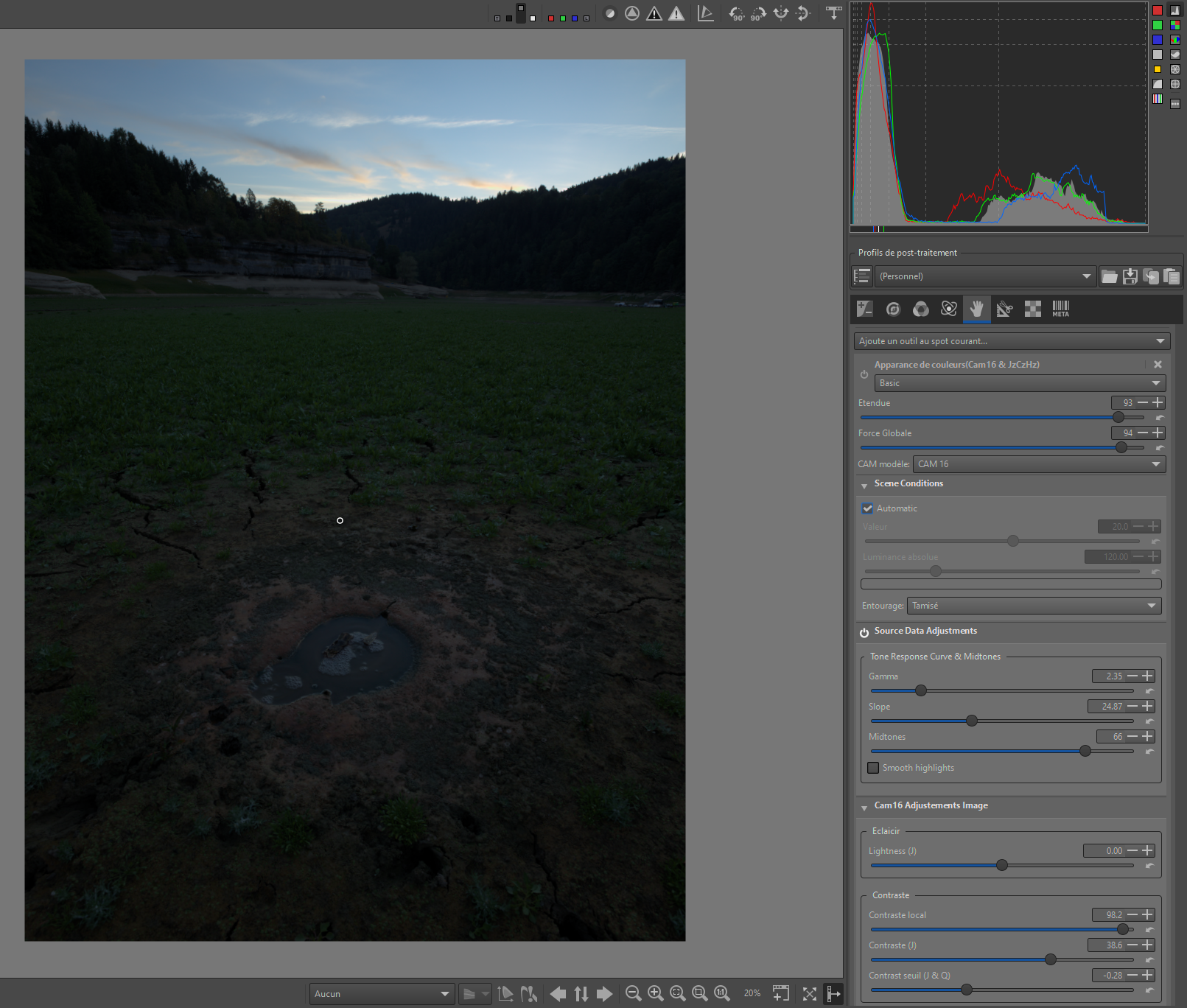 - As I’ve said several times, Ciecam is very powerful in colorimetry (I won’t go into detail about its features, which are explained in several posts and tutorials), but it’s very difficult to integrate complex “external” functions into the 6 variables used (Lightness, Brighness, Saturation, Chroma, Colorfullness, hue).