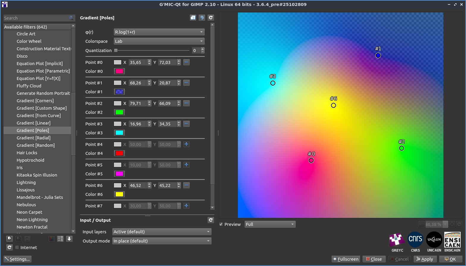 - [gmic-qt-363] New filter Rendering / Gradient [Poles] generates color gradients from moveable colored keypoints, directly on the preview widget.