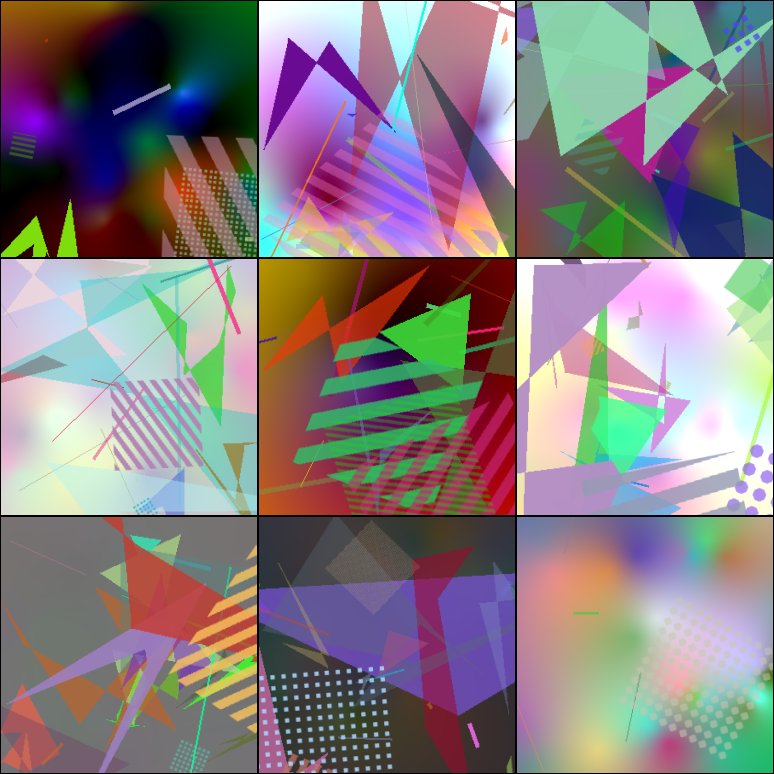 random_patchesrenders a set of square images containing random geometric shapes and textures. Useful to generate input images for training neural networks without copyright issues (e.g denoising or upscaling networks).
