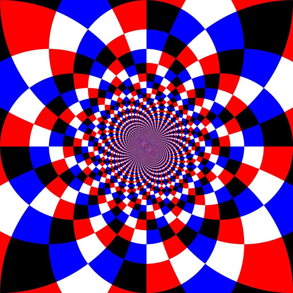 $ gmic 2048,2048,1,1,"L = clog(20*([x,y]/w - 0.5)); P = cexp([log(40/exp(L[0])),L[1]]); 85*xor(P[0]%4,P[1]%4)" map 6 rs 50%