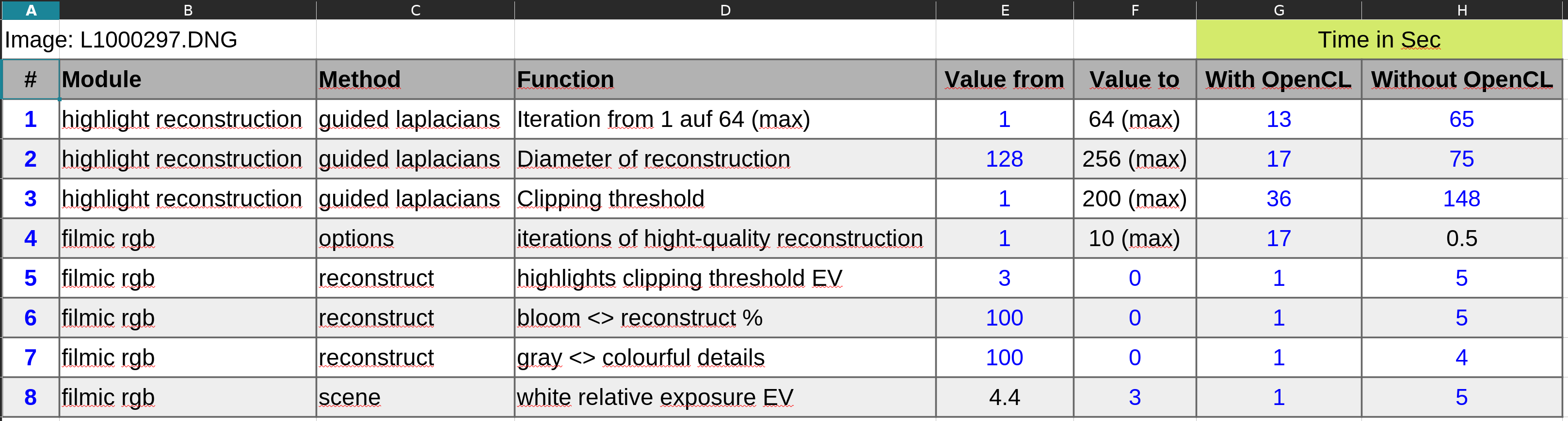 When I started the computer and darktable first time with the new graphic card I was unsure whether OpenCL works or not. So I finished a quick&dirty series of measurements with OpenCL enabled and the same again with disabled OpenCL settings. The setting was “OpenCL scheduling profile=default” and “tune OpenCL performance=memory transfer”.