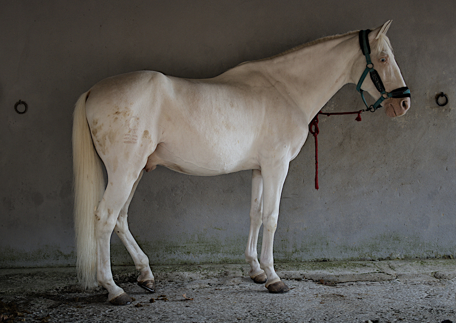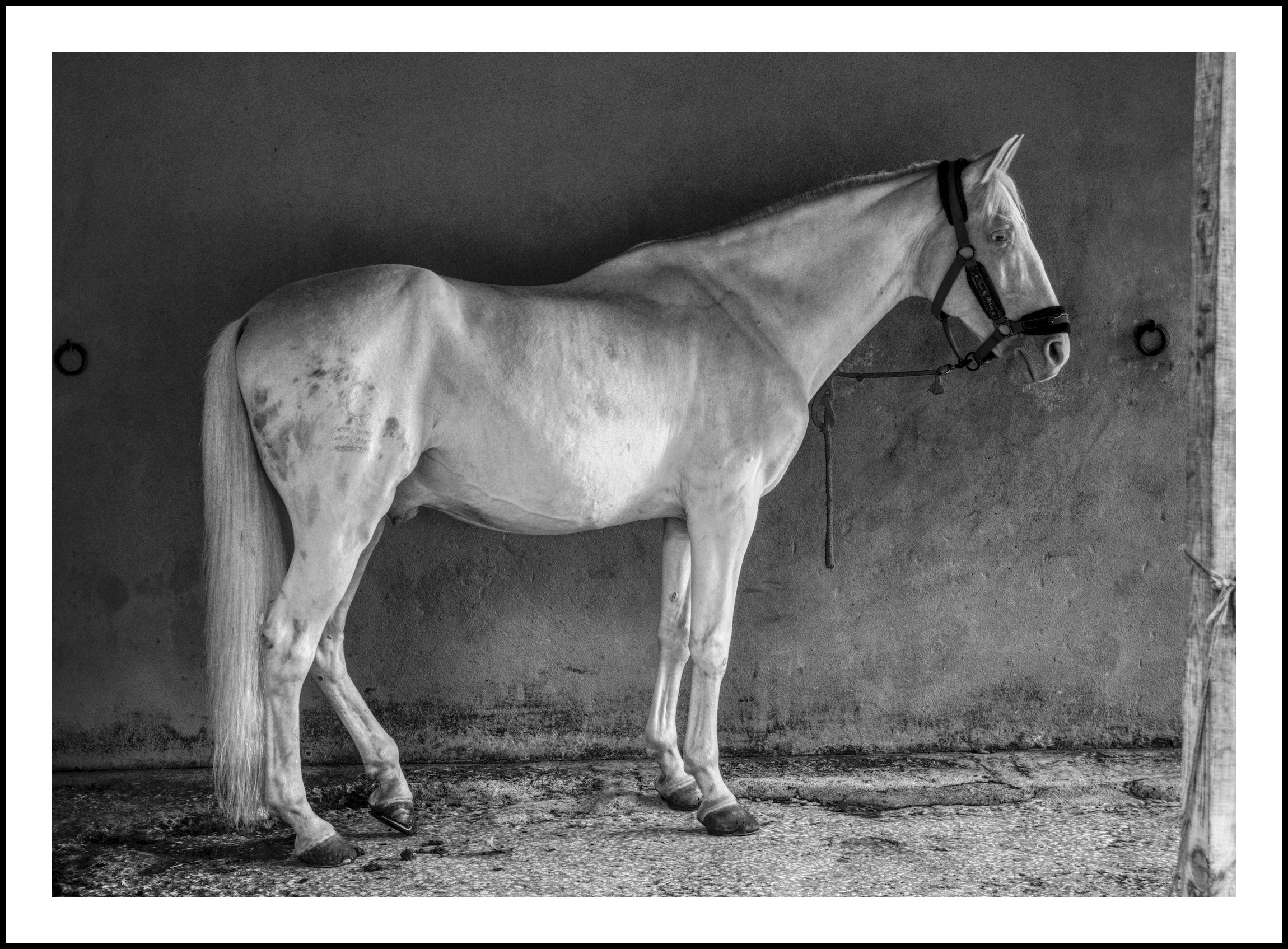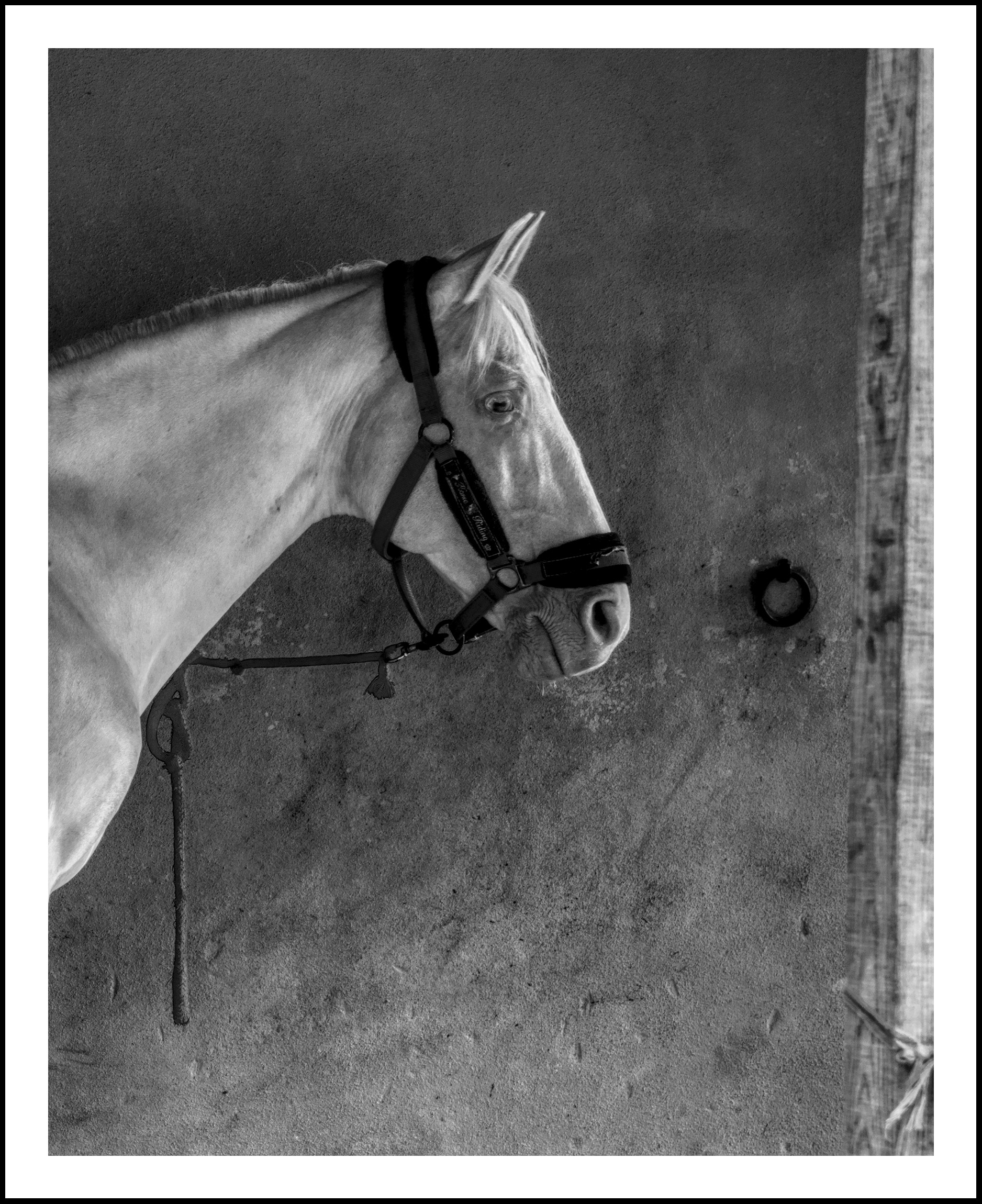 I have no clue of horses. But I link horses to meadows and open sky. So maybe next time put your horse somewhere outside to make a photo. I find it hard to make a nice edit showing it in the stable. Anyway here is my try to get some live in this grey in grey: