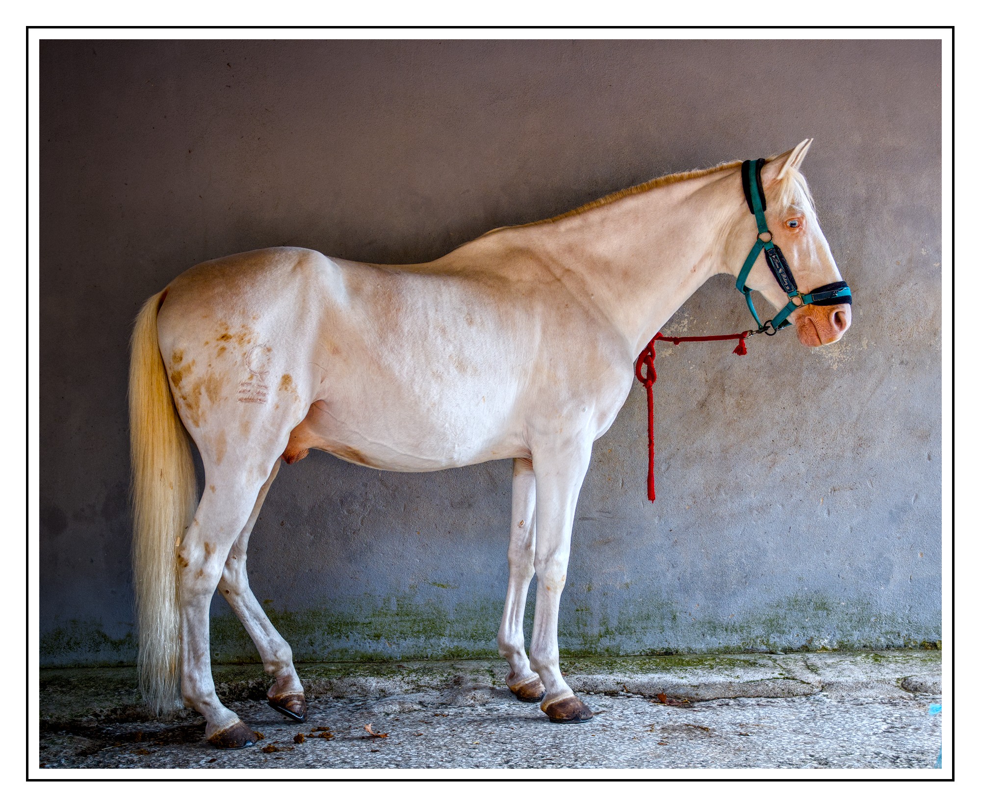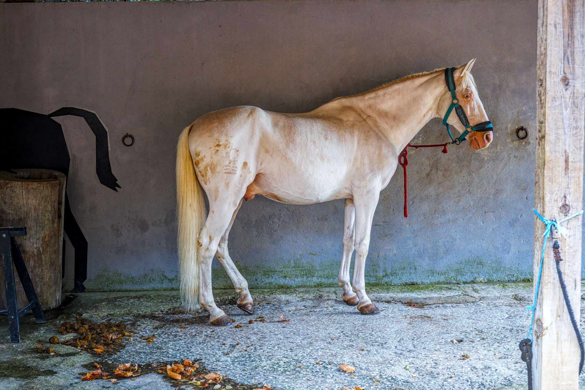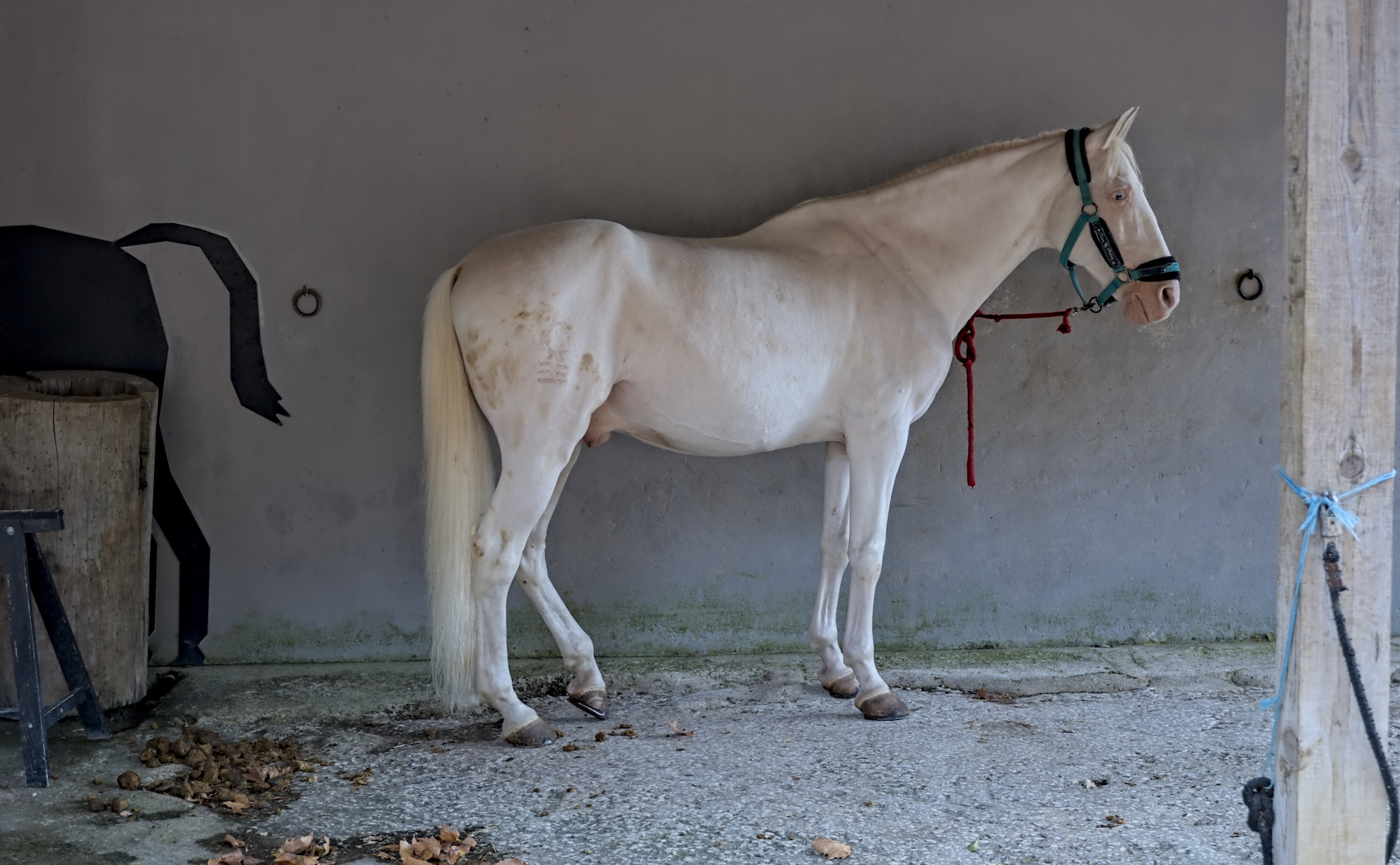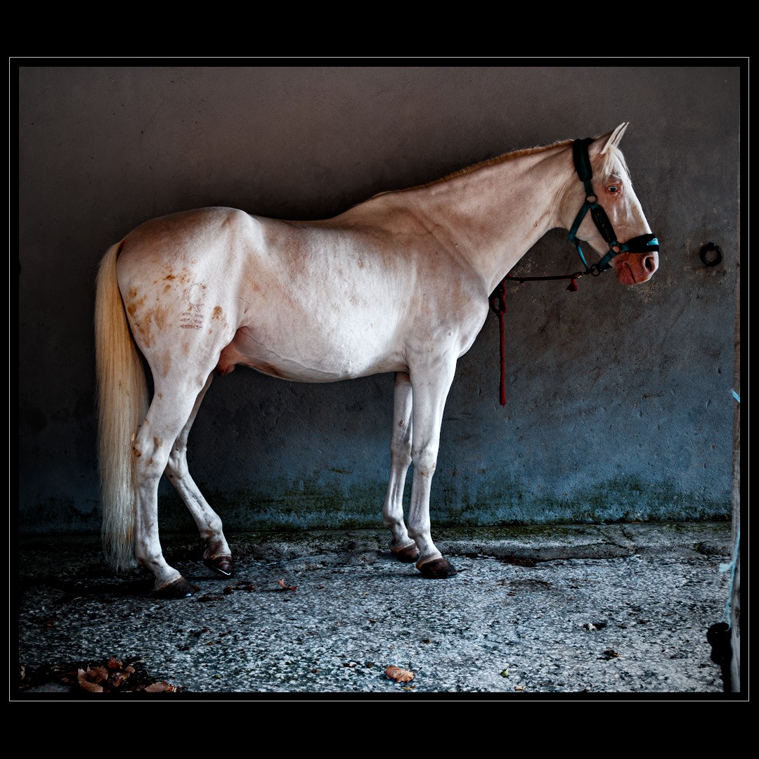 I have no clue of horses. But I link horses to meadows and open sky. So maybe next time put your horse somewhere outside to make a photo. I find it hard to make a nice edit showing it in the stable. Anyway here is my try to get some live in this grey in grey: