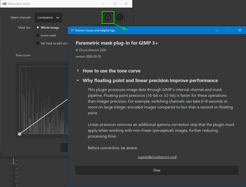 The idea was inspired by Yasuo Ohnishi’s parametric masking work for GIMP 3. My plug-in takes a different direction, using a curve editor instead of sliders.