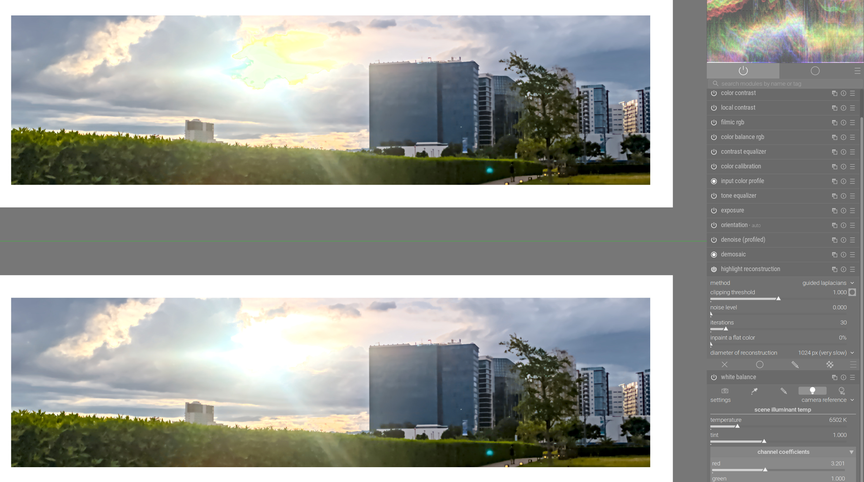 Darktable v5.2.1 (so without AgX) also handled this image very well in all places except the sun beaming through the clouds - even though I am not an experienced user. I would even say, it’s the best result so far, except for the color shift bug where the sensor (unavoidably) clipped, which ruined the whole effort. I have checked that this Filmic bug is not fixed in 5.3. Also, frustratingly, it only manifests itself on export, not during the edit.