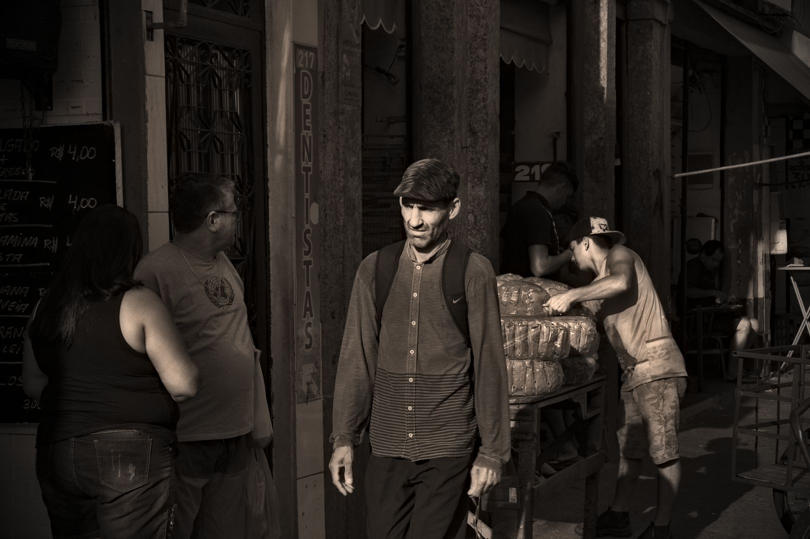 The eye really likes to go right for the individual moving the packages. Using masks I emphasized the main subjects face a little and with another mask tried to tone down the package man without making the lighting feel fake.