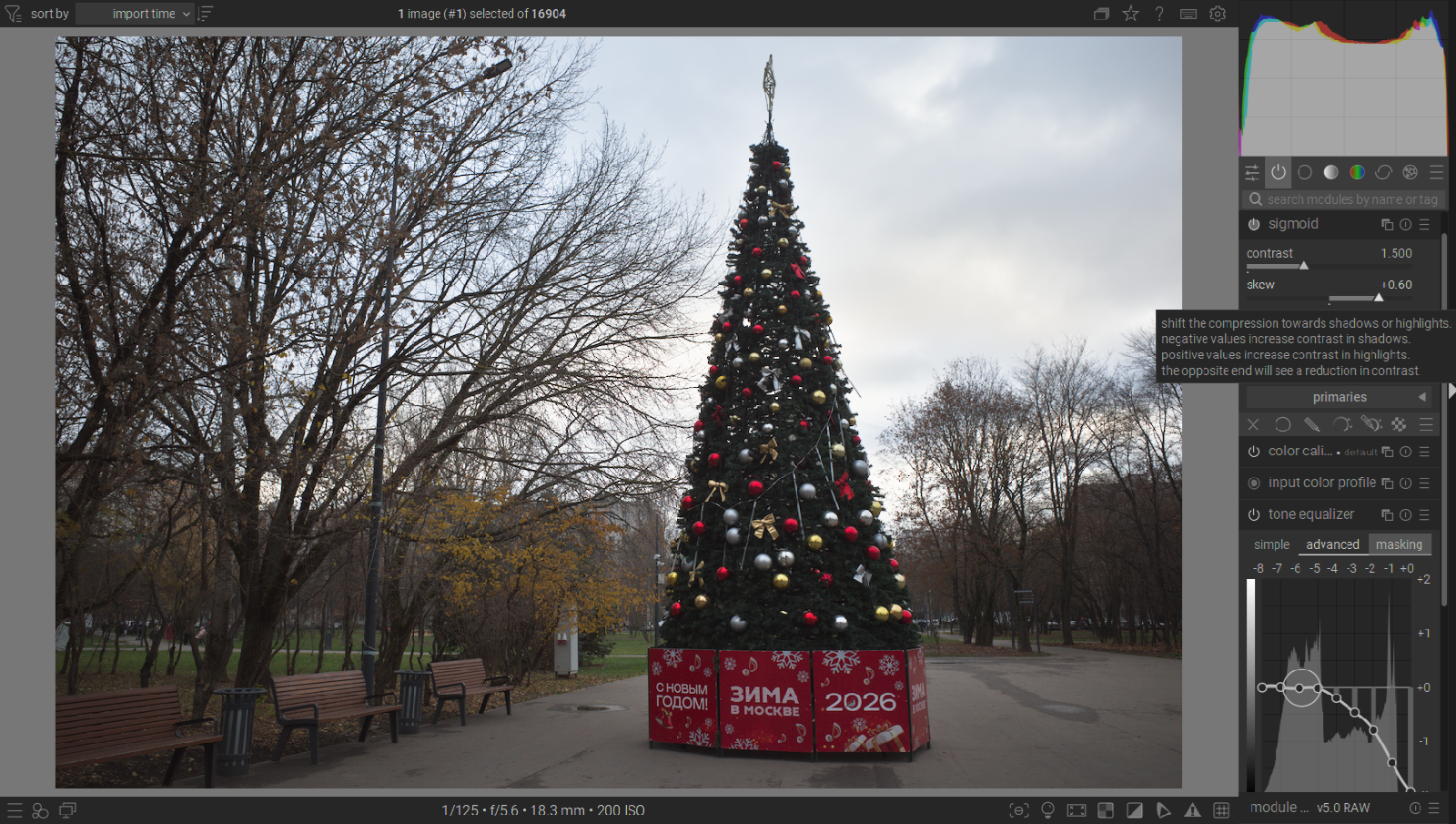 The skew pushed to the right, which, as per description in this tooltip, is supposed to favour contrast in the highlights, doesn’t do much beside lifting the highlights a little bit.