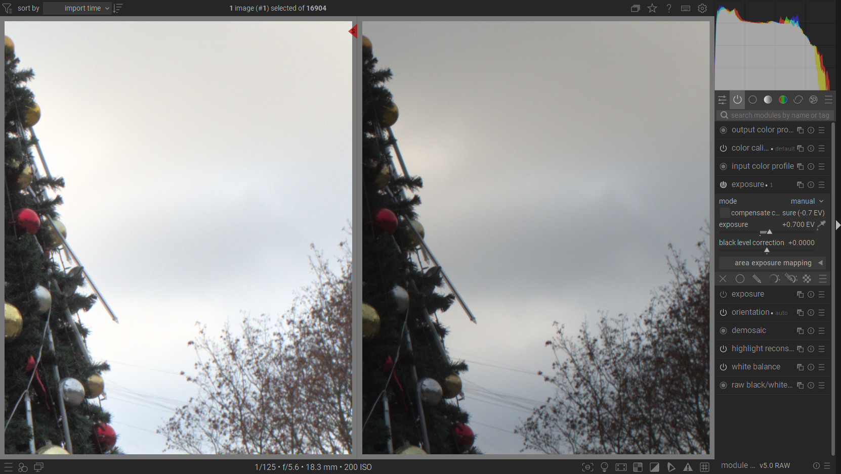 And finally, the same configuration with “filmic rgb” (left) versus a better exposed (1.0) configuration with the “base curve” preset “ricoh-like” (right). The result looks quite similar if we discard the fact that the rest of the image is heavily underexposed.