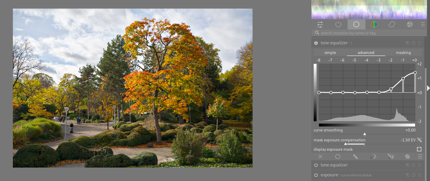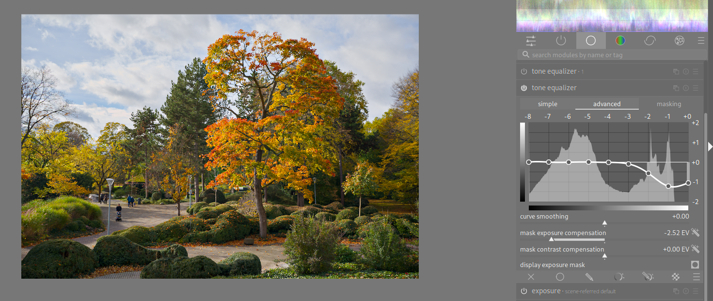 As the Christmas three is quite well defined in separate areas of dark shadow and lighter areas, a simple alternative to lifting shadows by tone equalizer, may be to use the shadows slider in the perceptual brilliance section of color balance rgb module. There is a certain overlap between the effect of the shadows, mid-tones and highlights sliders, though, as can be seen illustrated on the mask tab. We can reduce this overlap and concentrate the slider’s effect more to the shadows and lower part of midtones by increasing the value of the shadows fall-off slider.