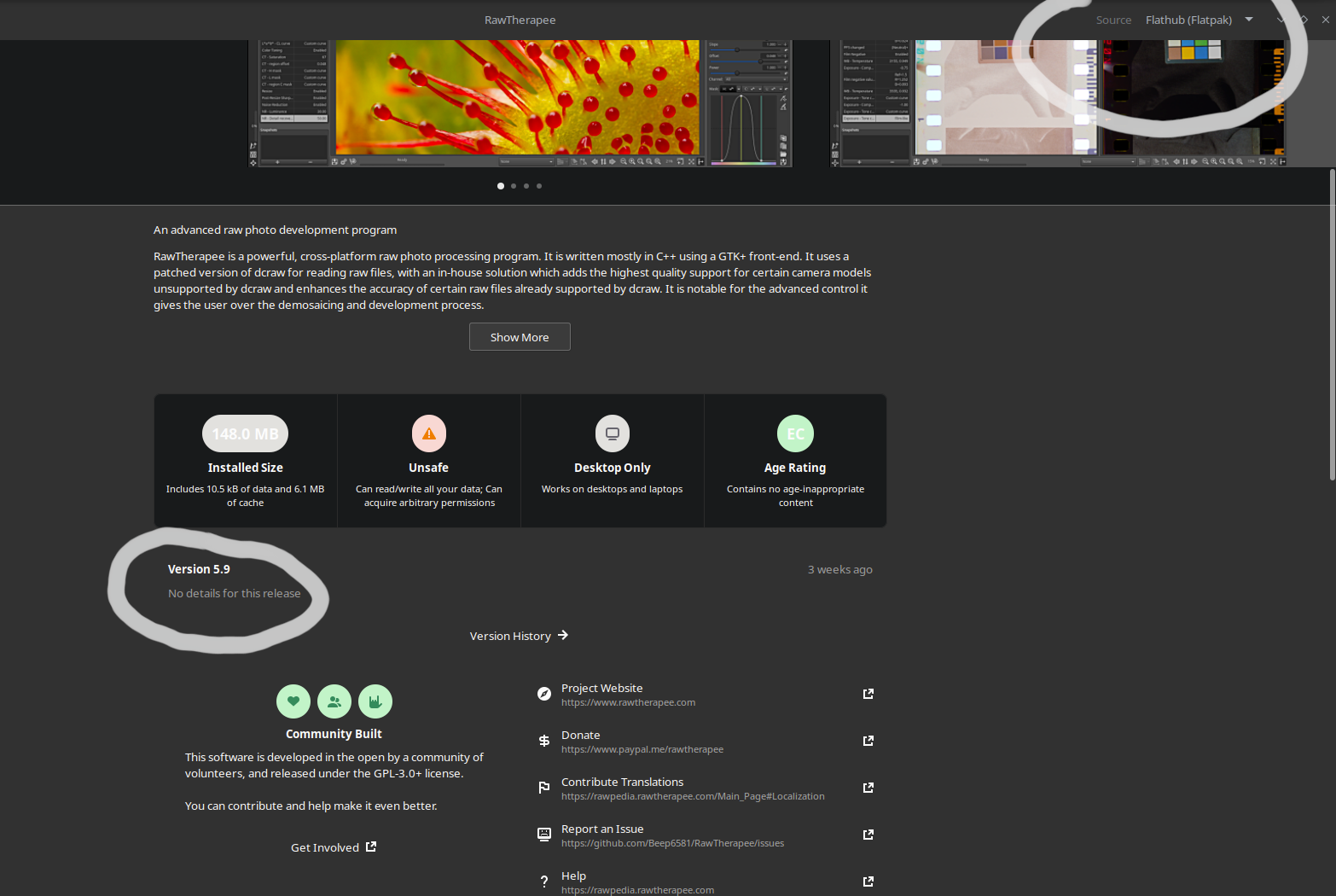 I downloaded FlatSeal. It was nice because I could then see all my flathub programs. I went down the list and compared RT permissions my GIMP program and matched it. I am now able to access my files in RT 5.9. Thank you so much. I can now help people who run along this problem.