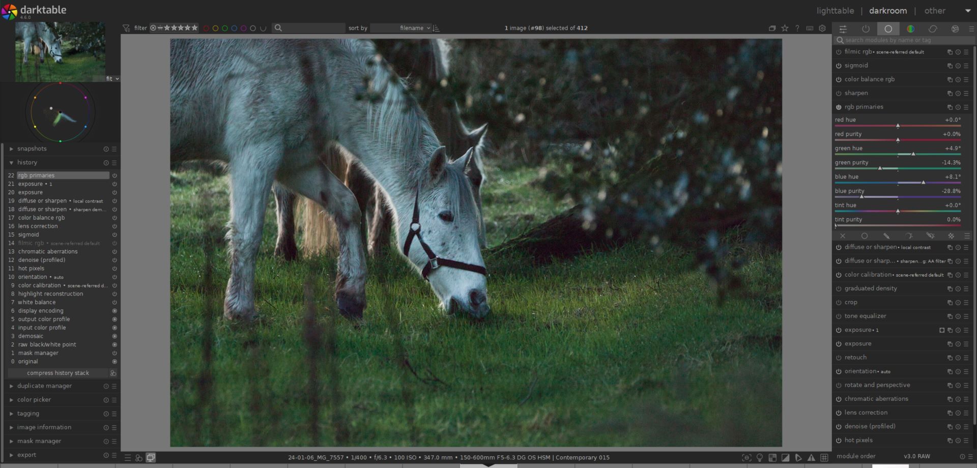 The default white balance is indeed not great, but measuring on the horse’s head worked well - just had to adjust the chroma. That still had a bit too much yellow for my taste in the grass, so shifted green towards cyan in rgb primaries. Also decreased blue purity.
