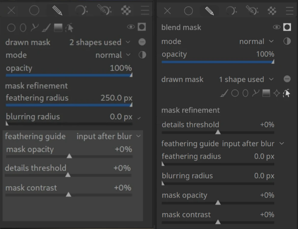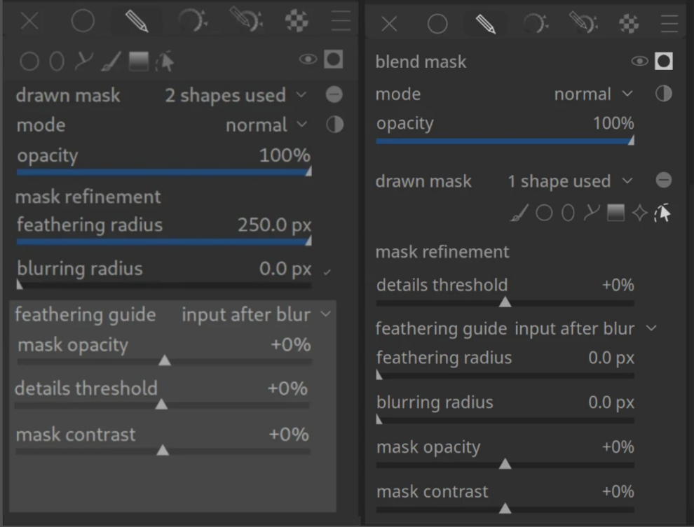 Better discoverability: The mask drawing tools (brush, circle, ellipse, path, gradient) are moved to the top, right under the mask mode. This makes it immediately clear how to start masking without searching through the “drawn mask”.
