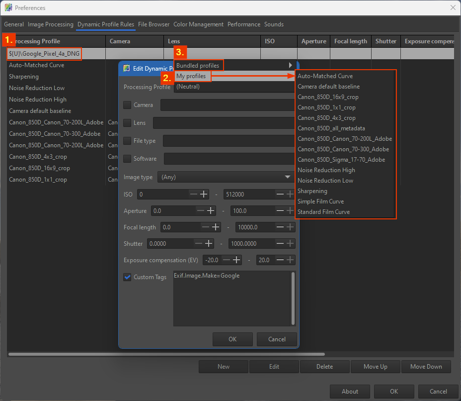 I just noticed most of my profiles as shown in the dynamic rules list were listed as ${U}whatever, e.g., ${U}Camera default baseline. Note this was only on the dynamic profile rules tab, they’re correct on disk. I was able to fix it by editing each rule and re-choosing the correct profile, which were listed properly in the profile combo list. However, this profile (Google_Pixel_4a_DNG, #1) doesn’t show up in the list although it’s still on disk, unchanged: