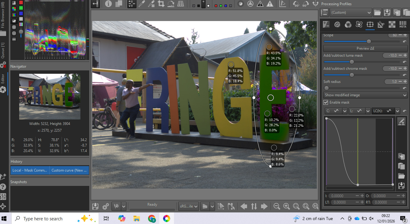 RT’s masks are inferior to what exists elsewhere (RT, ART, and of course GIMP or Photoshop). They could be improved somewhat easily (by copying a little bit of ART, for example) , but making them compatible with deltaE and the principles of Selective Editing is a challenge I can’t tackle alone (at least at the GUI level… remember, I’m not a computer scientist at all, but a scientist…). If anyone knows how to do this with a mouse, it would be a significant advantage for Selective Editing by adding the ability to draw polygons (which must meet the algorithm’s requirements).