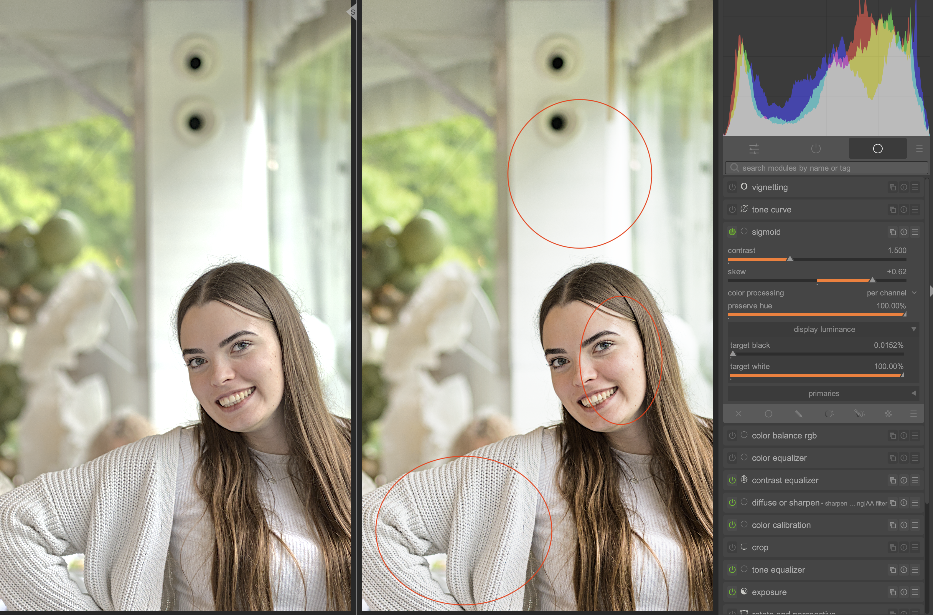 I changed a bit the sigmoid setting to soften the contrast in the midtones a little bit, even though I don’t think there is too much contrast on the face of your edit. That’s it.