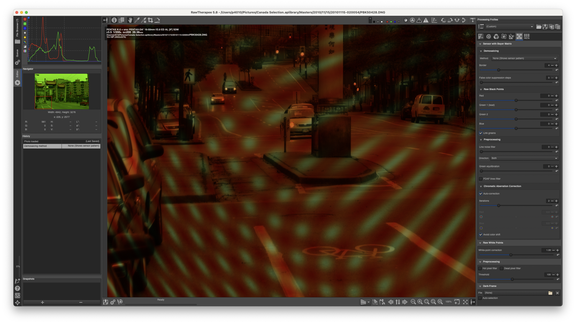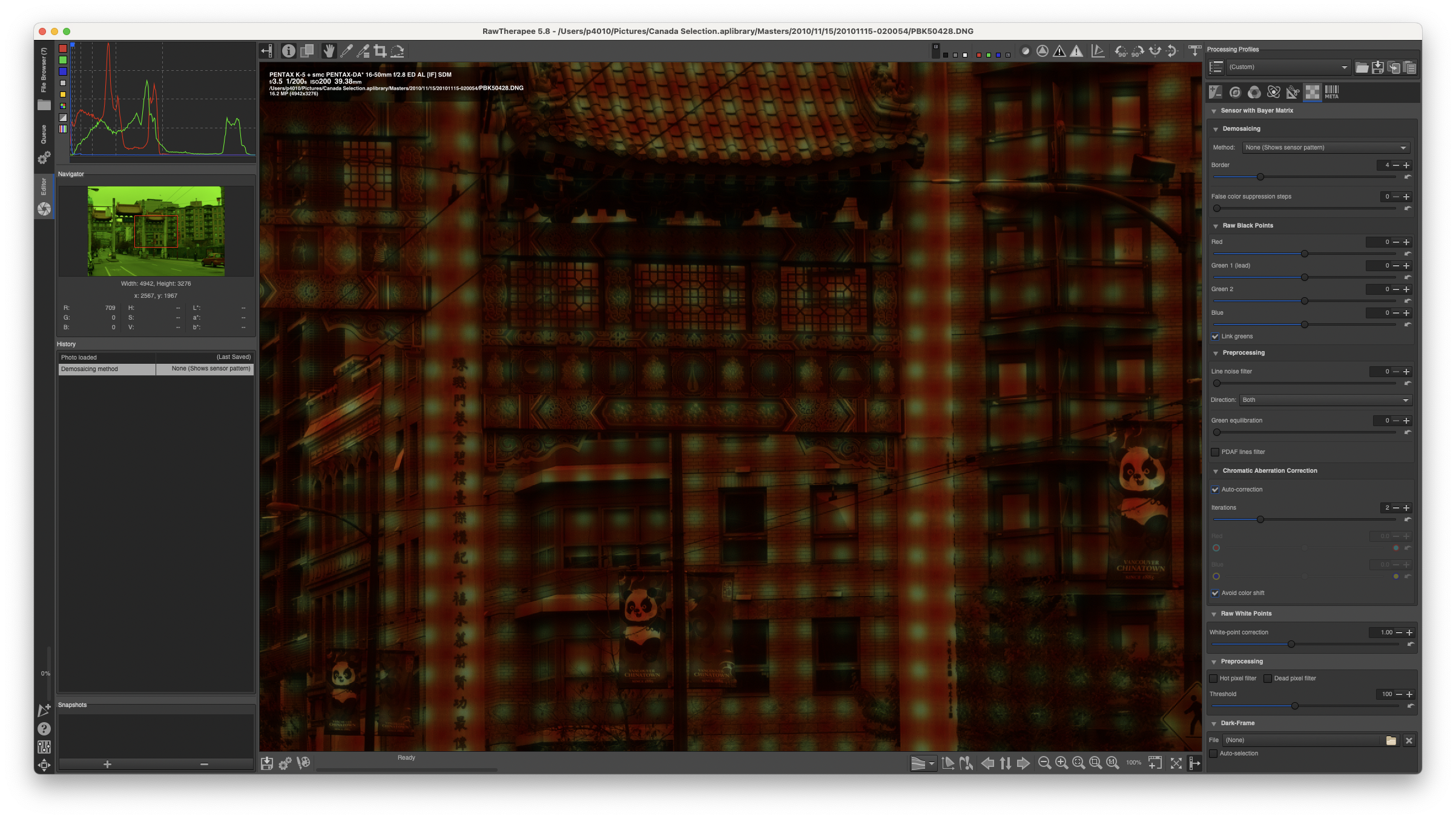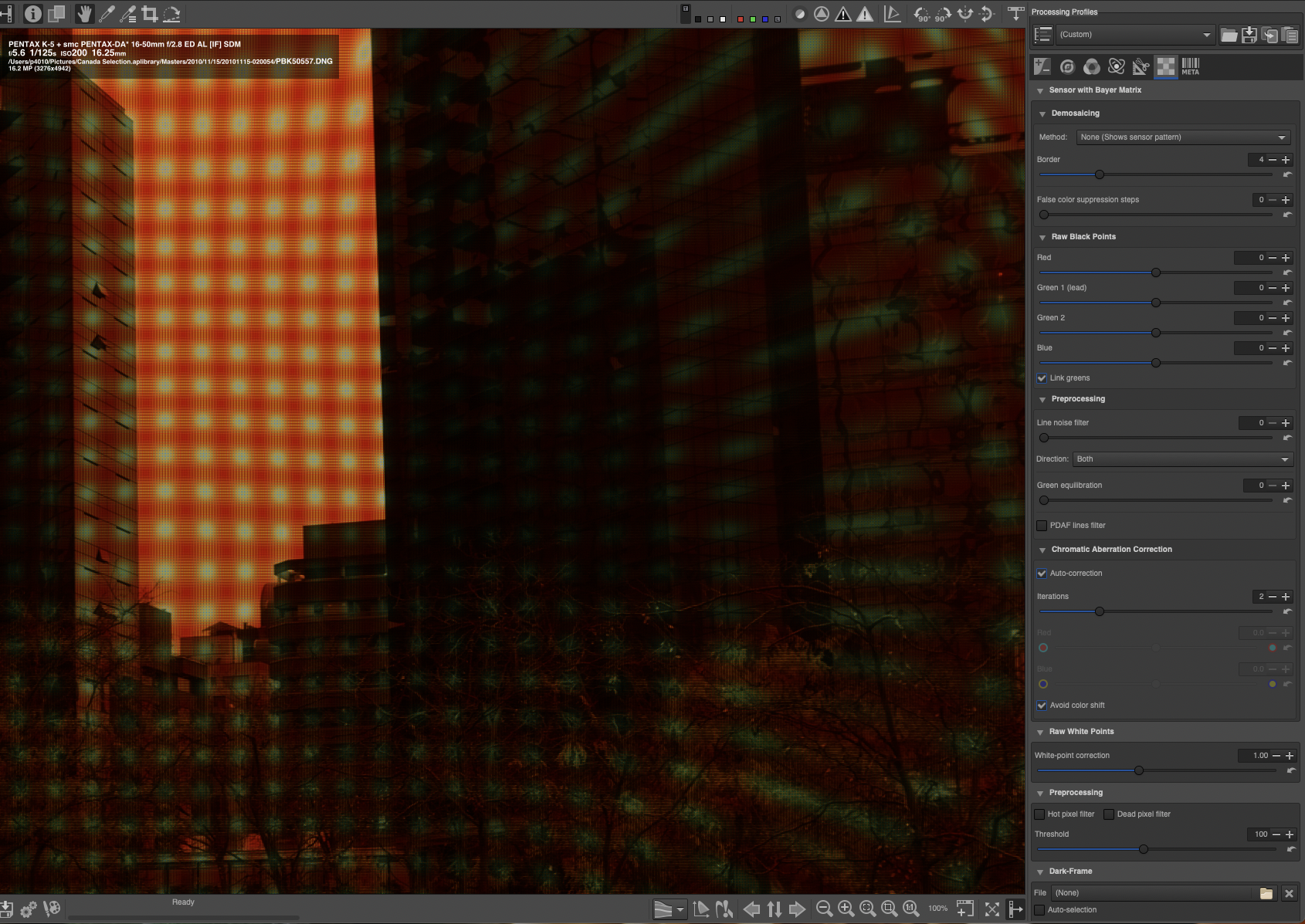 - the pattern shows up from a certain zoom level on: it is not evident at 100% fit, then boom it shows at some point as you zoom in (at about 3x, but it depends on the camera), and it remains there (locked to picture features!) even when one sensel takes 10x10 screen pixels (or more)