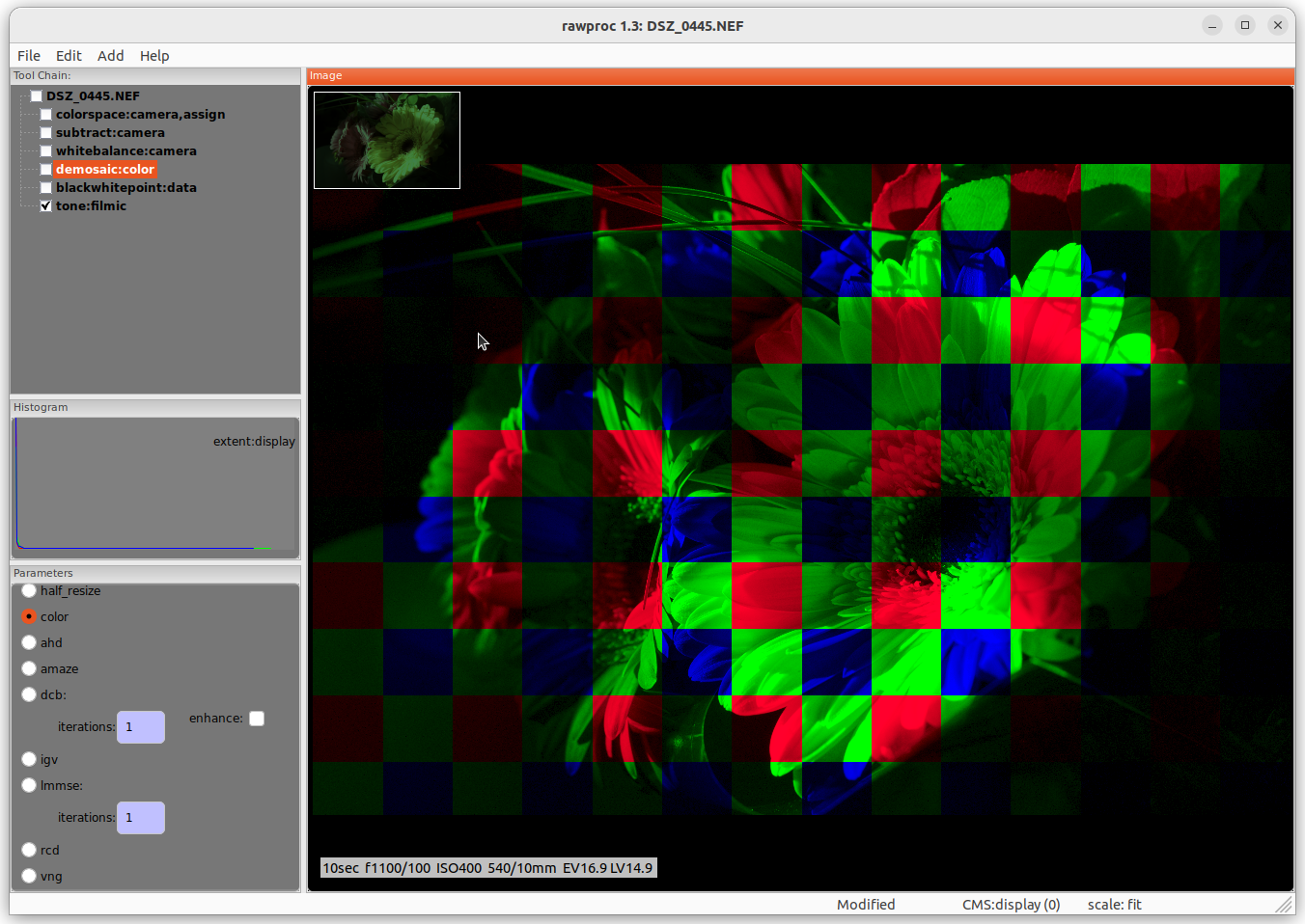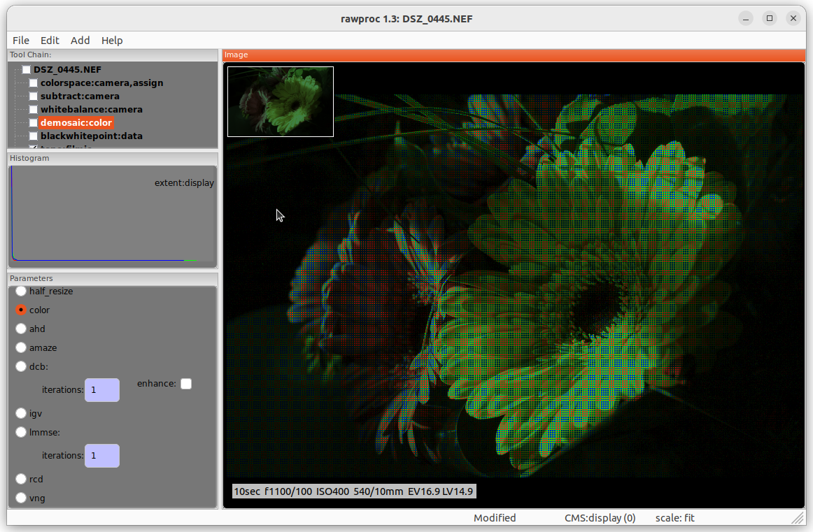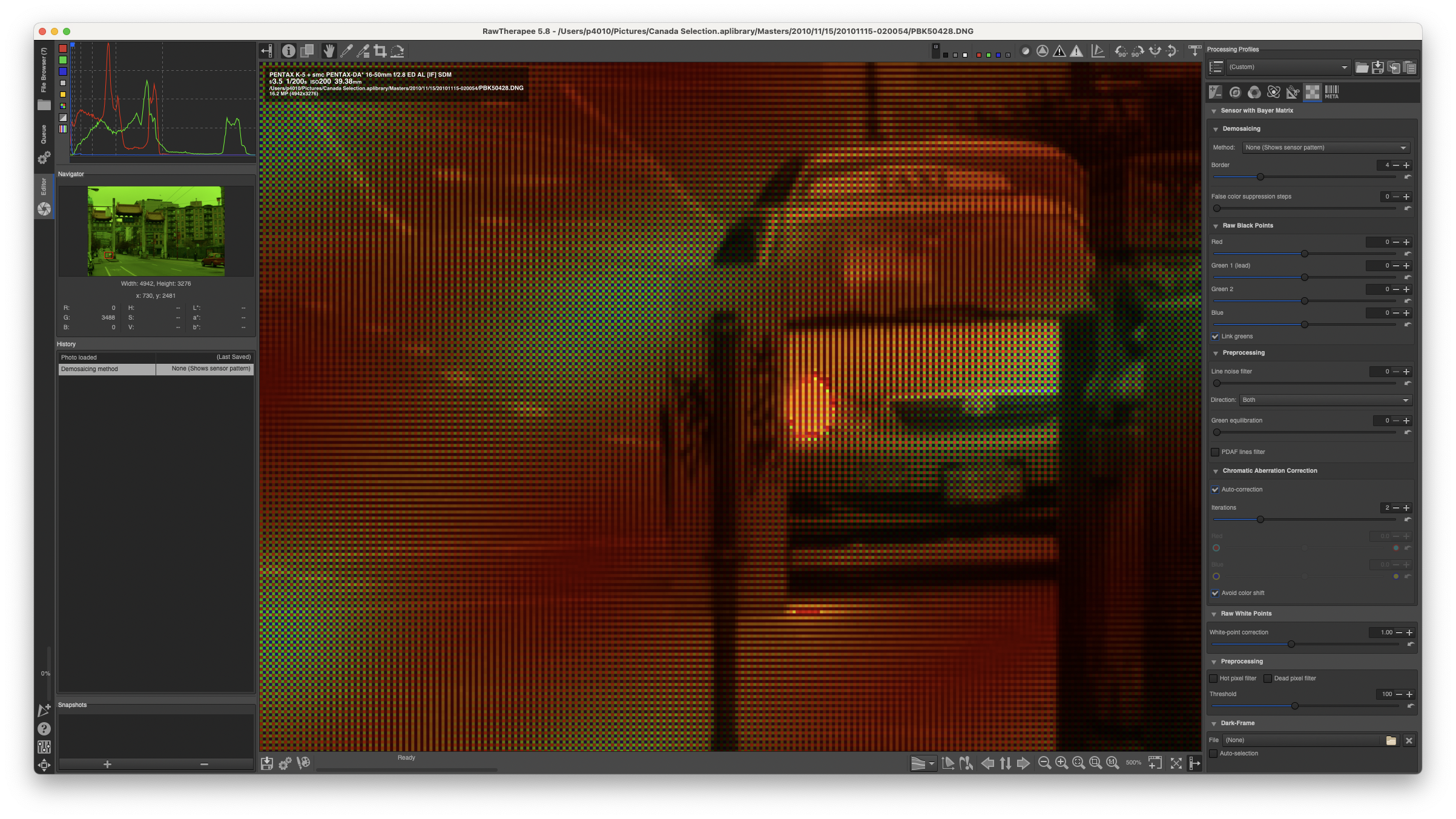 - the pattern shows up from a certain zoom level on: it is not evident at 100% fit, then boom it shows at some point as you zoom in (at about 3x, but it depends on the camera), and it remains there (locked to picture features!) even when one sensel takes 10x10 screen pixels (or more)
