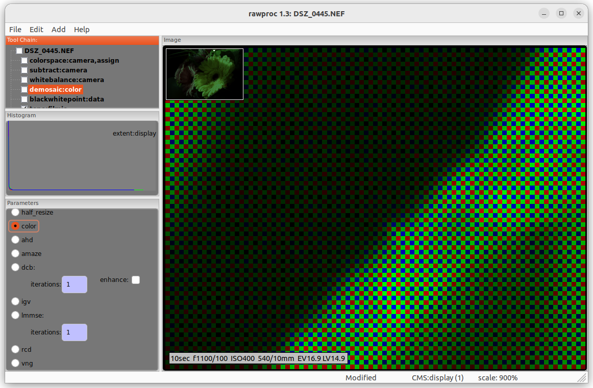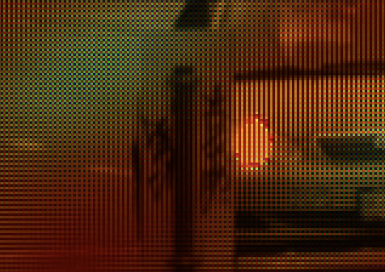 To actually “see” red, green and blue values for the Bayer array, I had to write a special mode into my demosaic tool to color the pixels accordingly. Here’s what I see using it at 900% zoom: