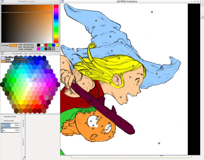 edit: I like the possibility for a reference image, as in your example. Maybe something like this can be a complement to the usual color picking function of G’MIC (GIMP), when it is needed. For linking source colors and target colors, the system from the “Colors transfer [advanced]” filter (like my example above) seems more convenient.