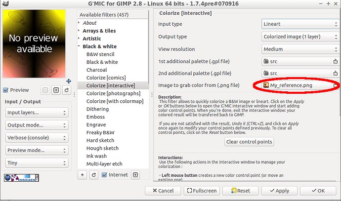 There are two color transfer filters in G’MIC. Maybe there can be a third one based on CLUT (Customize CLUT filter)? With an interactive GUI like in the “Transfer colors [advanced]” filter. So you can interactive match colors, as in that advanced filter. But in the “CLUT transfer colors” interactive filter, there must be a possibility to place lock-color points also.