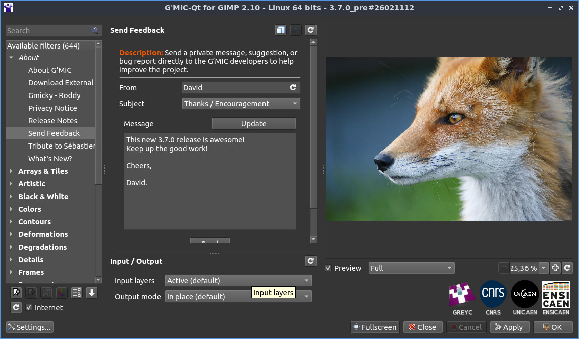 - [gmic-qt-370] New filter About / Send Feedback allows a user of the G’MIC-Qt plug-in to send a short feedback message directly to the developers.