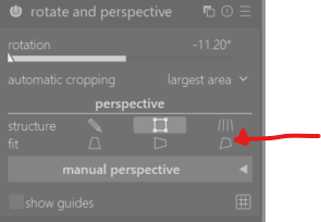 I use this feature a lot. It works great. After positioning the four corners click on the far right icon on the fit line. Also don’t forget there is a great user guide online that tells you about each module. darktable 4.6 user manual - rotate and perspective