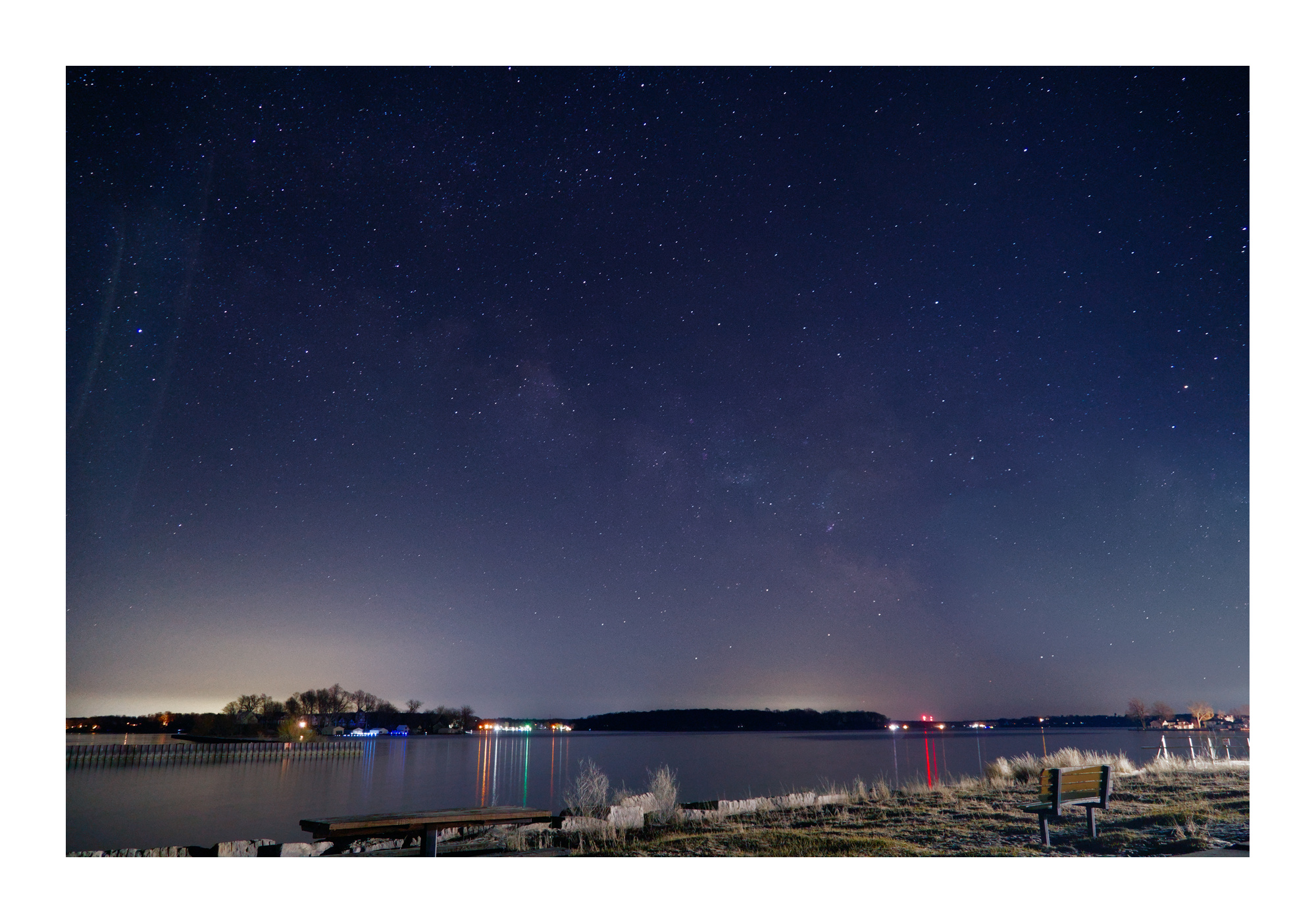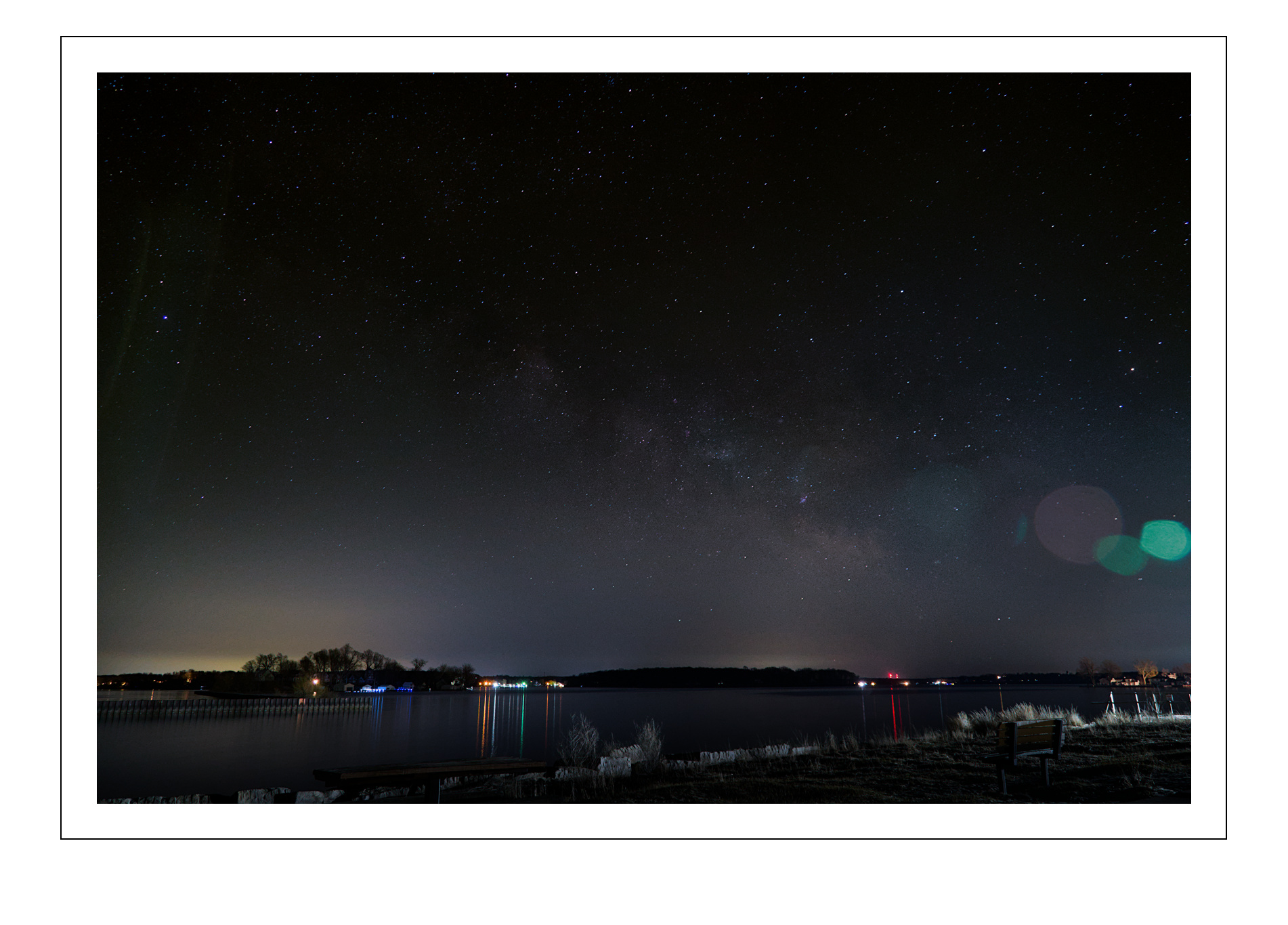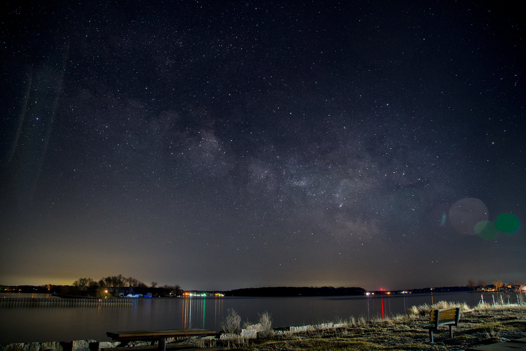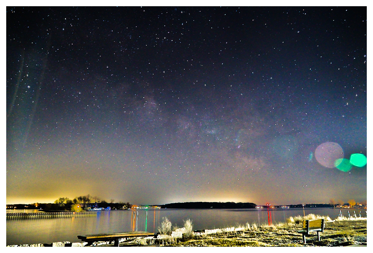 Also, with the below image, I know there is lens flare on the lower right from the building’s light, as well as on the upper left. Is the cloudy cluster inbetween The Milky Way, or more of the lens flare? I’ve included a second pic (screenshot) from Stellarium for the date/time of my image, and I believe this cloudy cluster in my image should be The Milky Way.