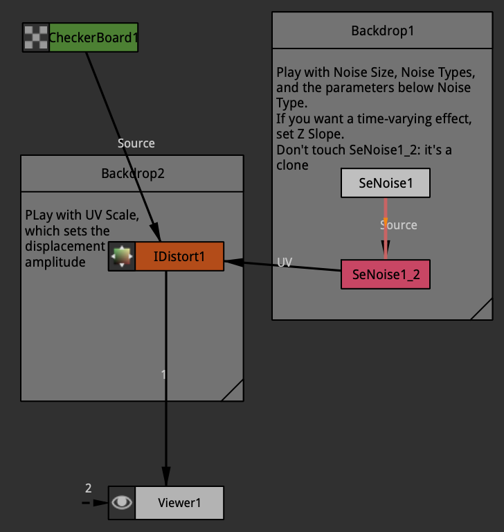 create some 2D noise. Itrequires two SeNoise instances, where “Noise Size” is linked between the two, and Z0 is set to 1 for one of the two instances. I’ll add an option to produce colored noise in SeNoise, so that it will require only one instance.