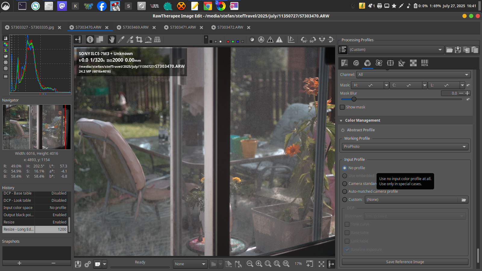 The images are shot with the same exposure/aperture/iso setting seconds apart with only the s-log setting changing; the lighter ones have it disabled, the darker enabled. Here are the links to the raw files and the pp3