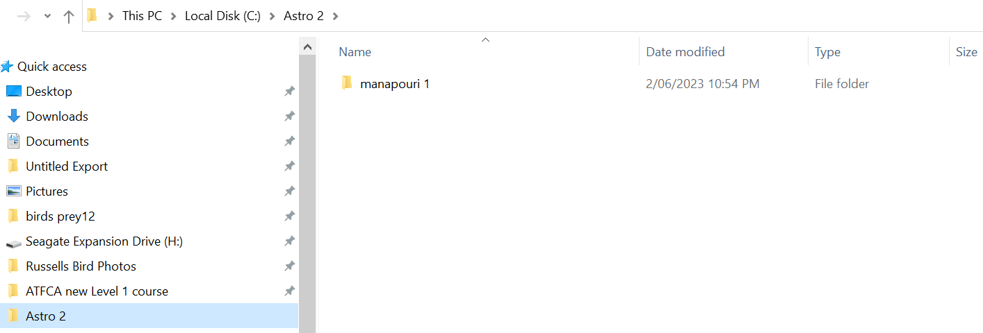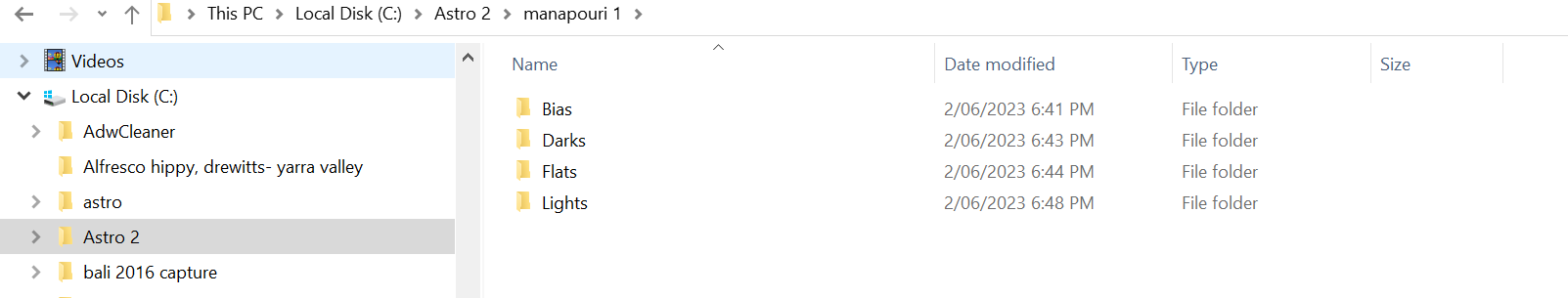 The operating file now is in C drive, before was in an external HDD. Operating file is Astro2, under Astro 2 if you open up is a file called Manapouri 1 and if you open this file all the calibration frames are located. All files are NEF(Raw)