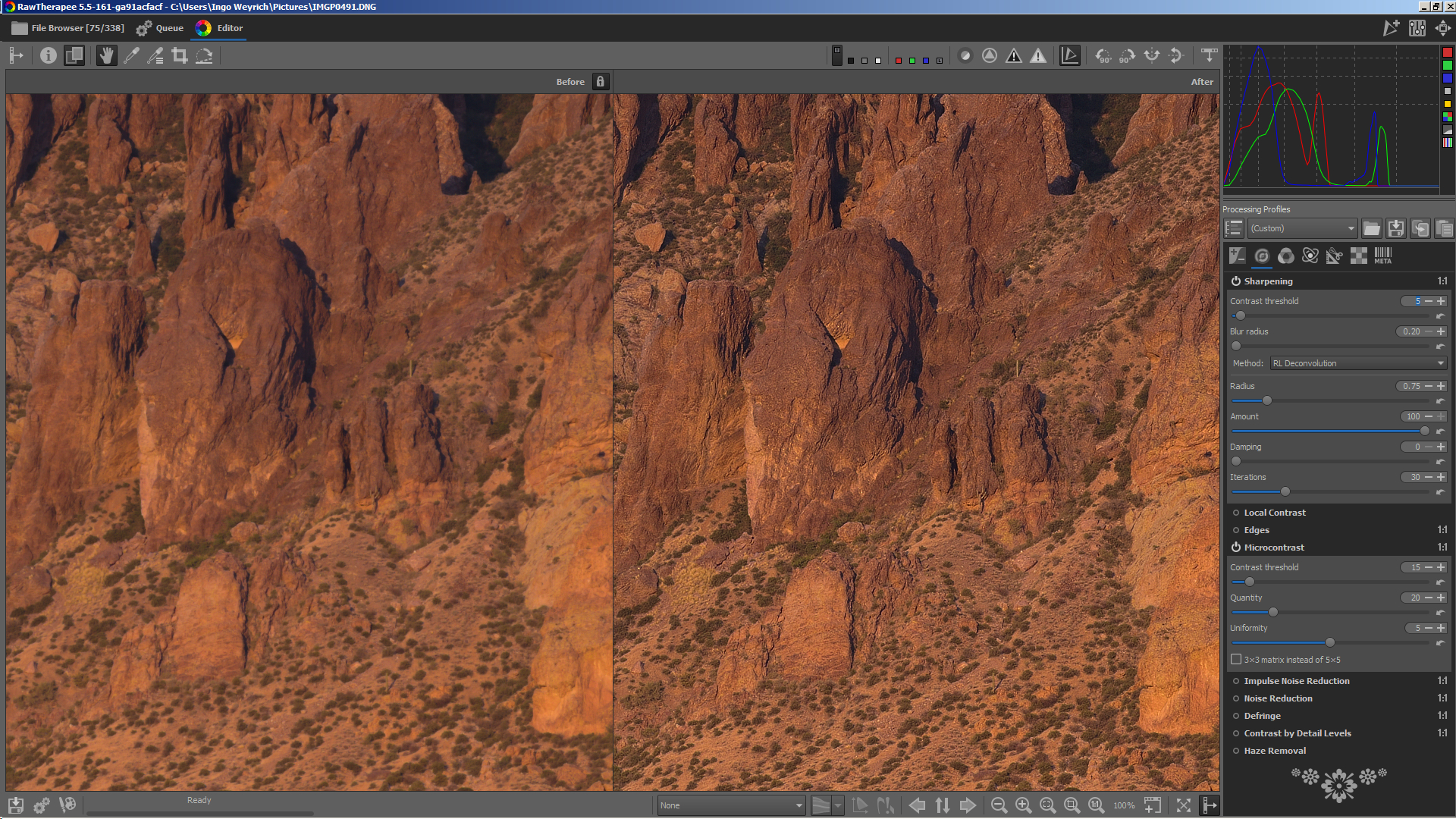 But even when using only RL there is no general rule for the settings (though I only change radius and contrast threshold). There are files from sensors like Nikon D200 where quite large radius settings work fine, which could one let assume itâs because of the AA filter in the D200 and itâs quite low sensor resolution (10MP APS-C). On the other side the almost same settings also work fine on a modern camera even when using pixelshift. For example this screenshot shows a 100% crop from a Pentax K1 pixelshift file. Left without sharpening, right with RL deconvolution: