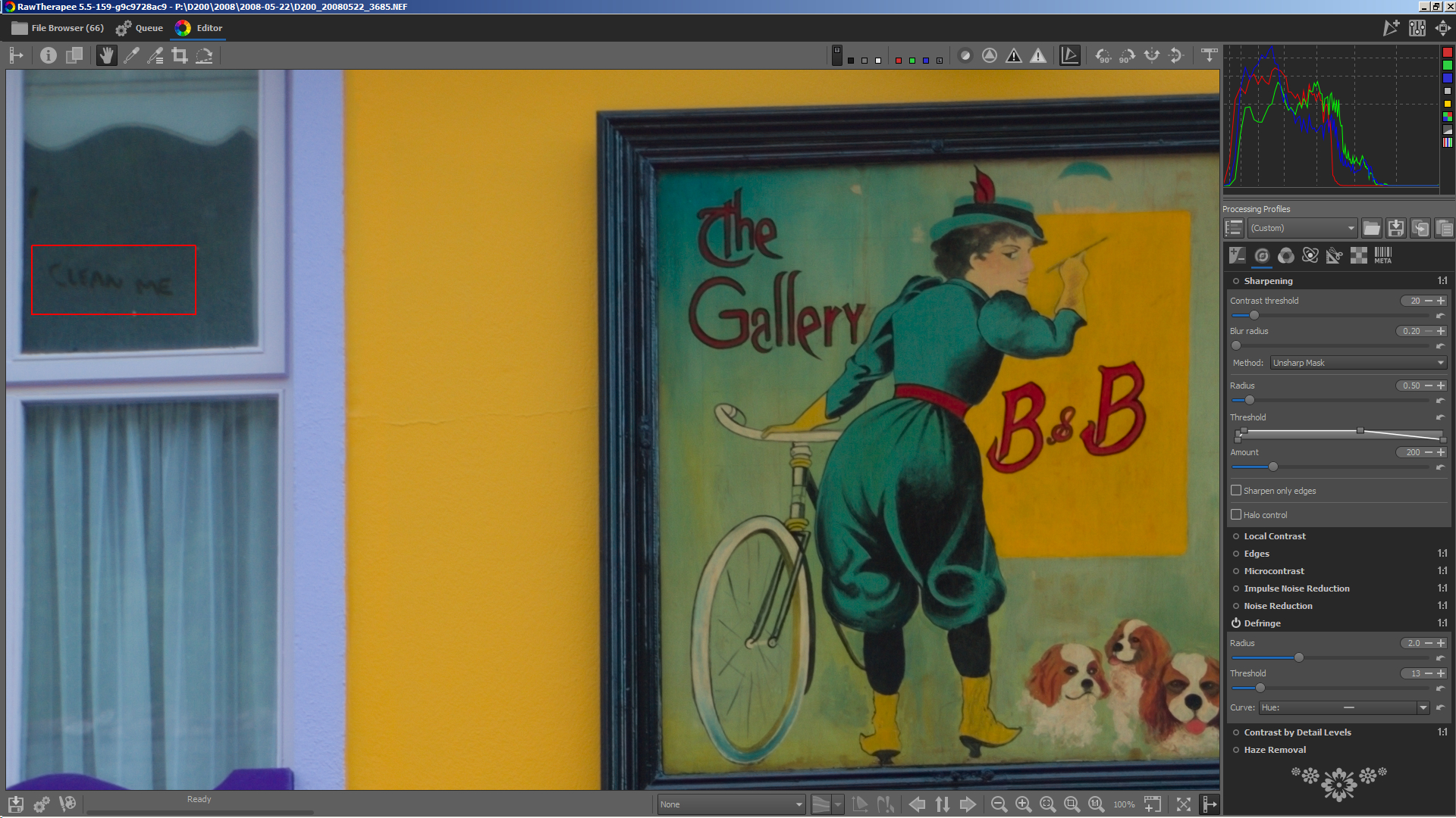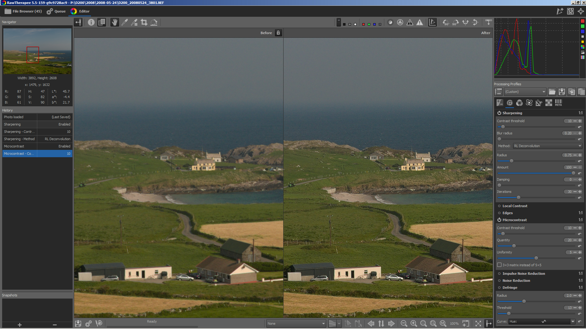 Left is unsharpened, right is sharpened. The history in left panel shows which settings I changed: