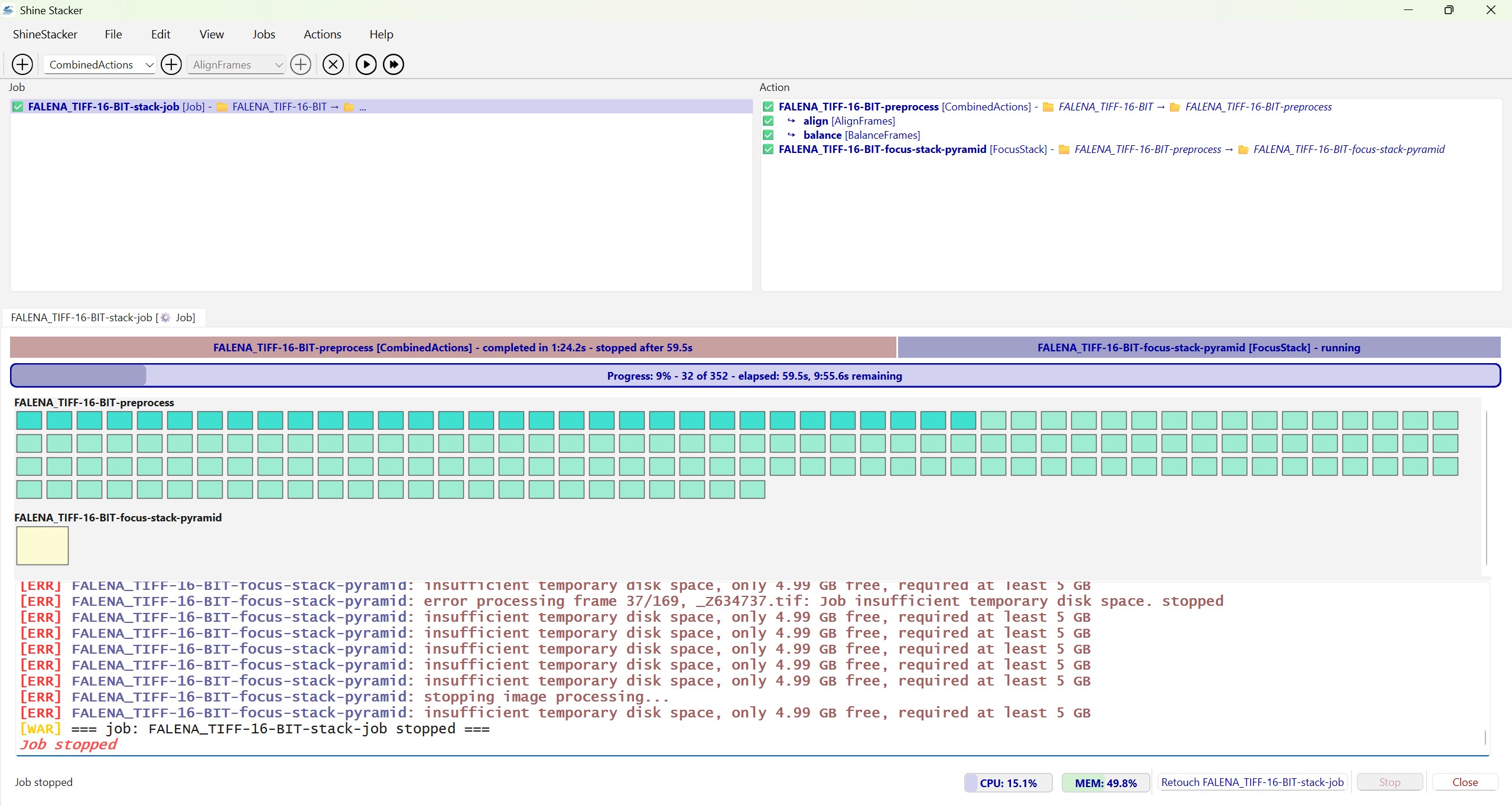 @Silvio_Grosso, I think I understood why you had a crash when attempting a unique stack with ~200 frames. The algorithms saves copies, split into tiles, of all images in a temporary system disk area for later processing. This is necessary because for a large number of frames not all images fit in memory. It is probable that you filled your system disk, and ShineStacker complained.