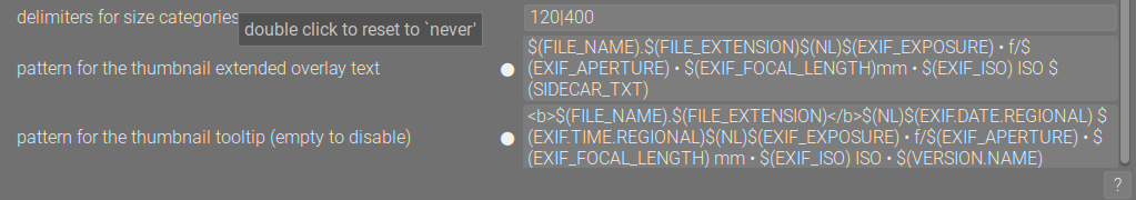 Hi, first post here and new to Darktable. I’m really liking Darktable having tried pretty much everything else (e.g. Photo Supreme, ACDSee etc). This is probably a very easy thing but I’ve been unable to work out how to do it. I’ve edited the ‘Pattern for thumbnail extended overlay text’ to show what I need but I can’t seem to add the file size - I can’t find it in the list of variables. I have quite a few duplicates and it makes sense to choose the largest image to save. I’m probably missing something very simple here and I’d be glad of your help. Thanks