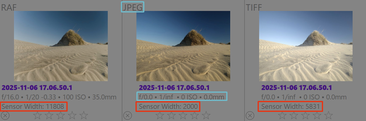 The variable you want is $(WIDTH.SENSOR) – the image below has the width of each image (outlined in a red rectangle—you could even have that info printed in red on your overlay to make it easier to find), and I can easily tell which is which by the width. Depending on how the duplicate was made there might also be other clues, such as the missing aperture, ISO, etc. data. For me, if I have a TIFF, I know it’s a duplicate. If I have a RAF and a JPG of the same image, the JPG is the duplicate. If I have grouped images, the group leader is the duplicate because I never change which is the group leader. Etc.