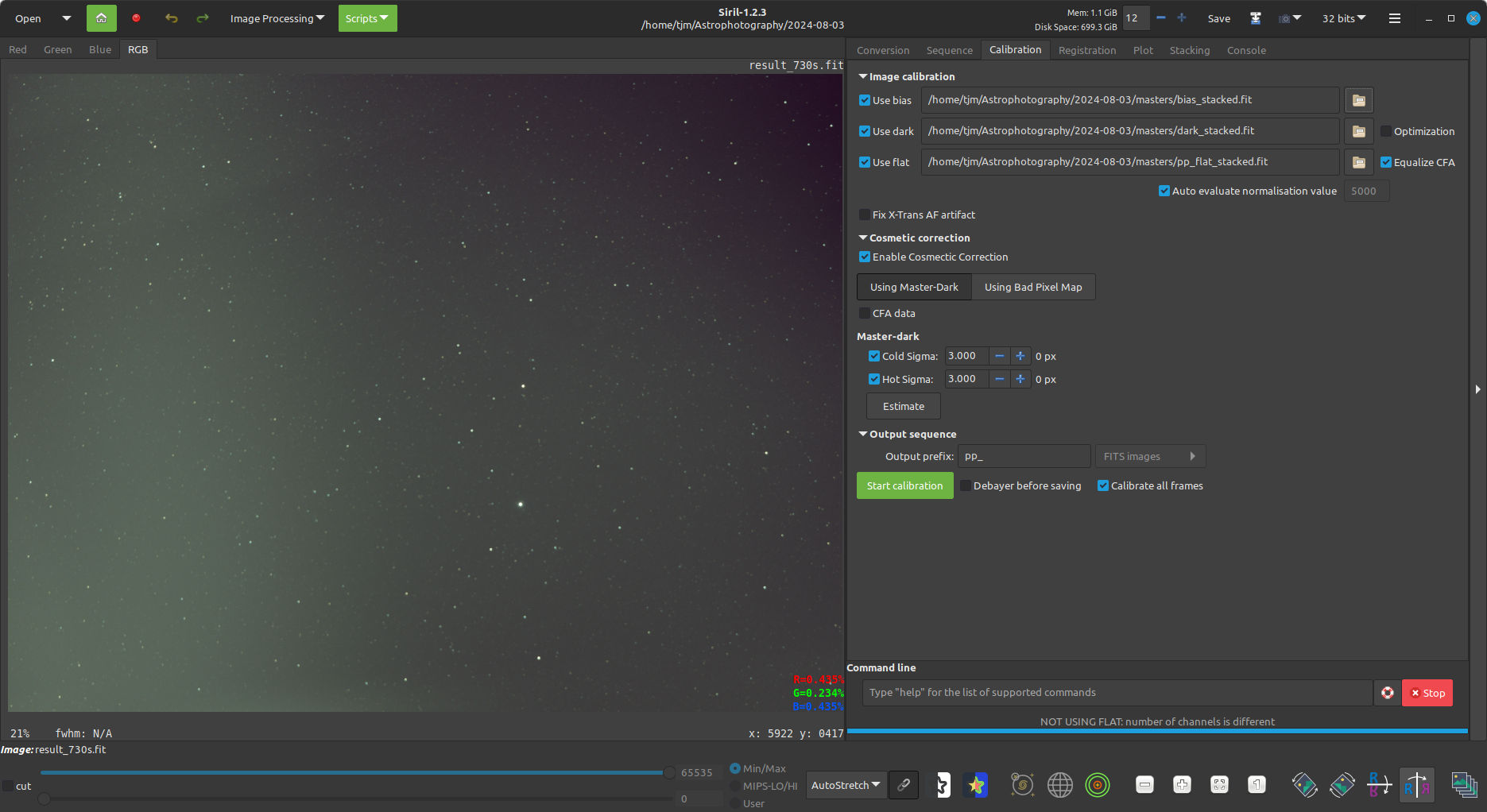 I’m just getting started with astrophotography and Siril, and I am attempting to process some raw photos I took of the night sky. I followed a couple YouTube tutorials and used the OSC_Preprocessing script, but I am getting stuck on image calibration. I took biases, darks, and flats, but if I try to calibrate using any of those, I get errors like “NOT USING FLAT: number of channels is different” and so on. I don’t know what this means or what I am doing wrong, and I can’t find much information on this. These stacks were created with the OSC_Preprocessing script.