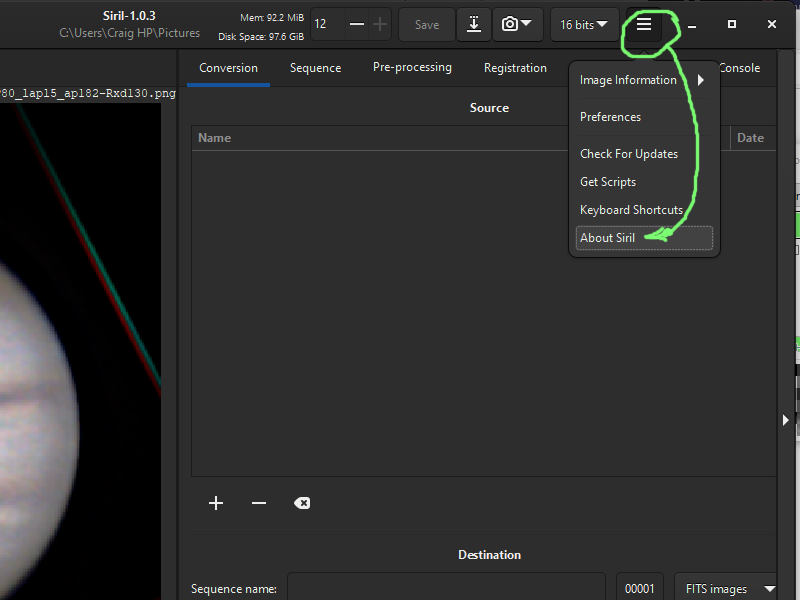 To get version info, just click the “options” menu (3 horizontal lines stacked) close to the upper right corner, then click “About Siril”