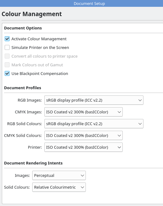 Now a question to the Scribus experts here: I saw that Scribus has various colour management settings. Should I enable them/set anything specifically here? I’m a bit afraid to do more harm than use if I set anything there wrongly.