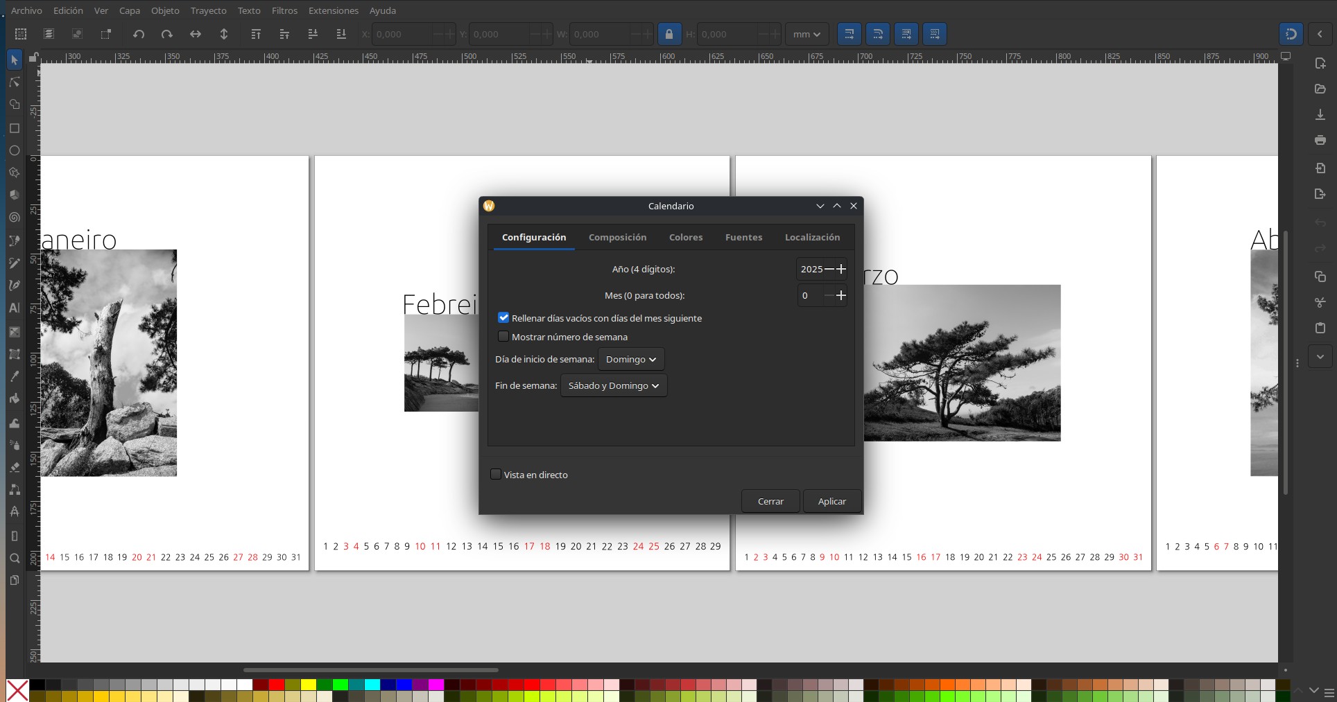 By the way, there is nothing against using prefabricated calendars or other suitable software specifically for this. I’ve done it myself, even before many years ago in Indesign. Resulting PDF or graphics can usually be loaded and edited easily in Scribus.