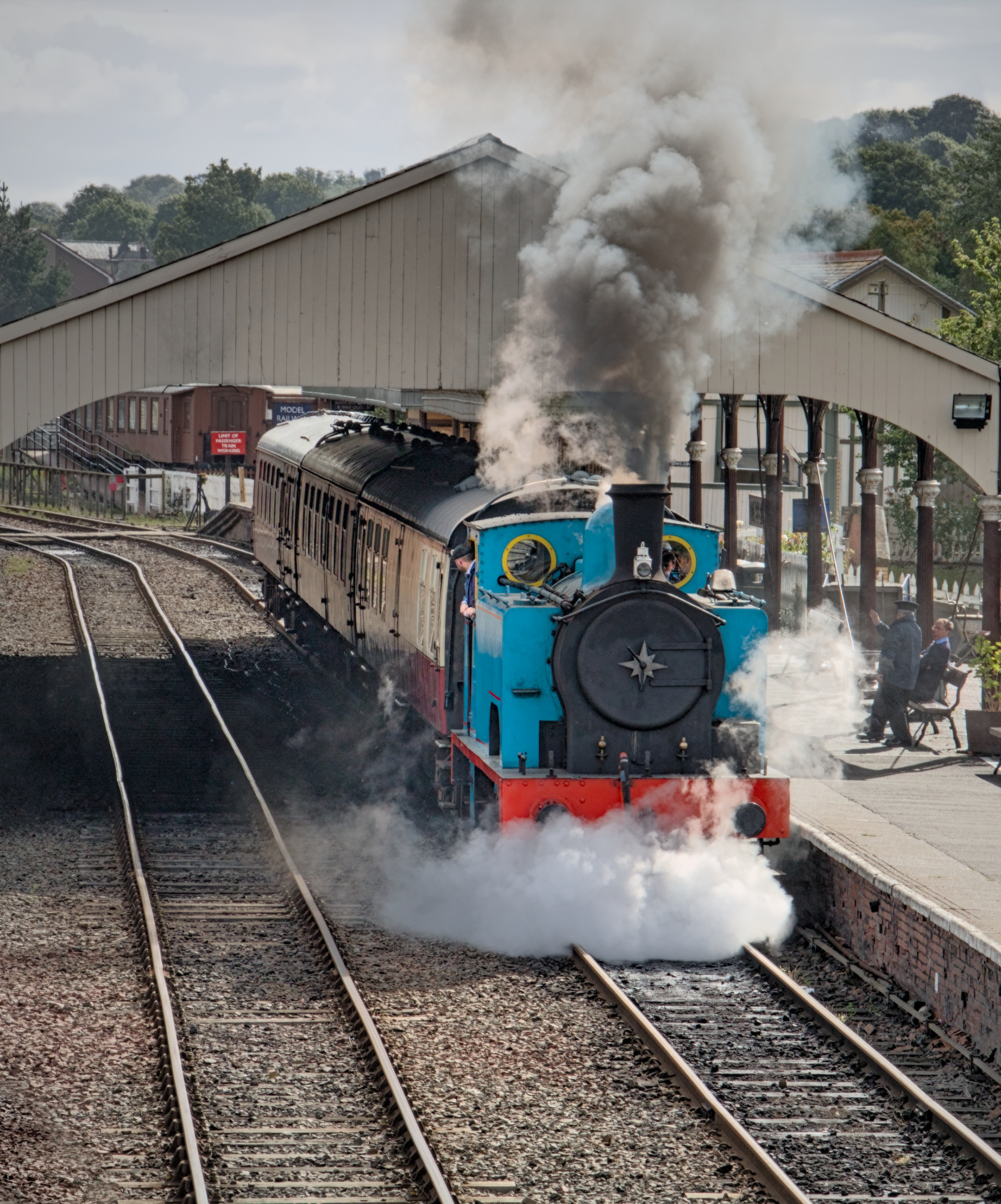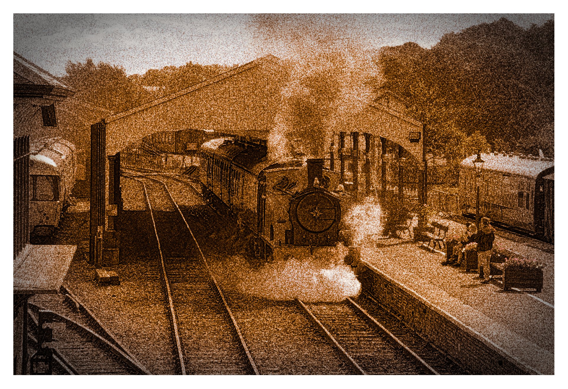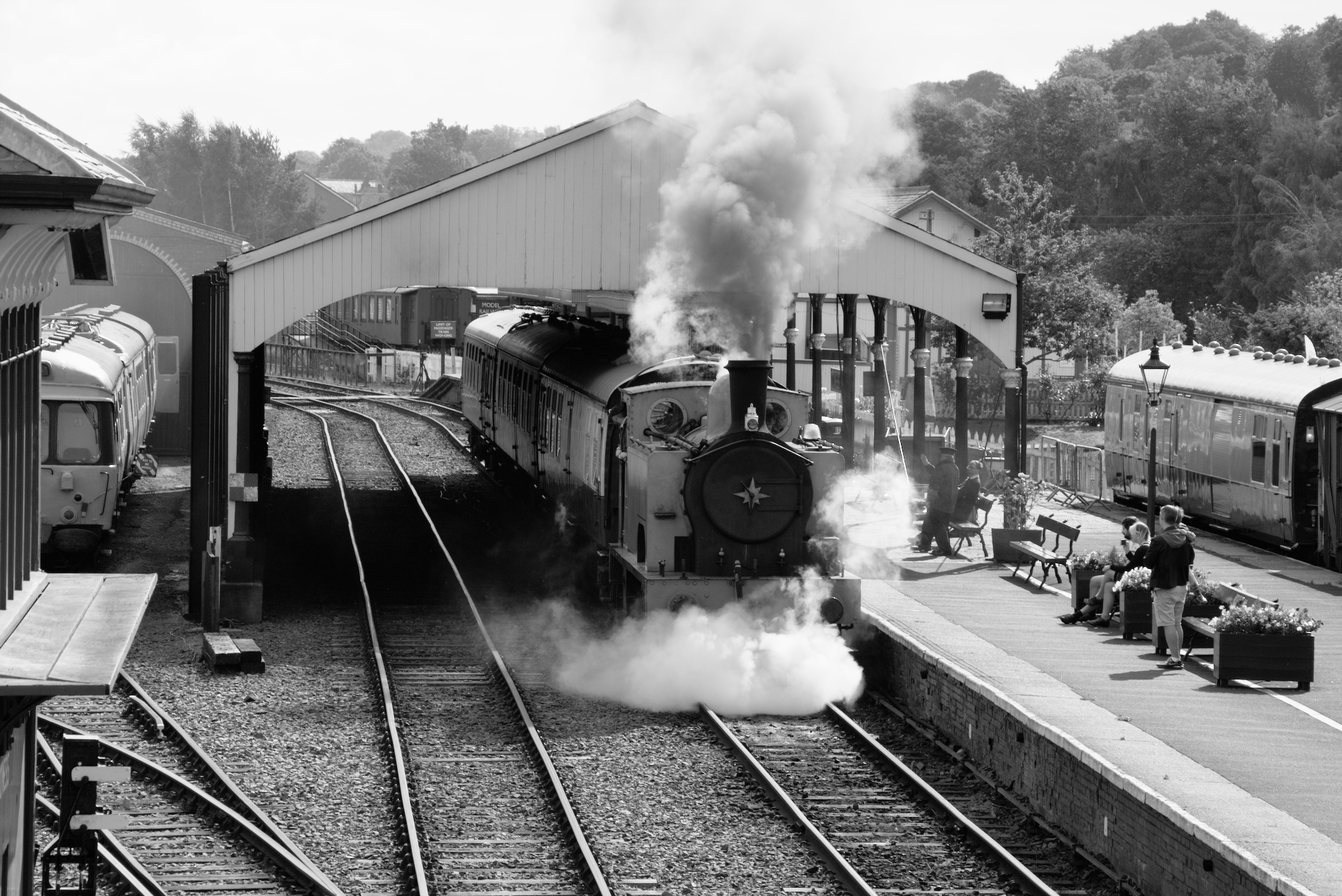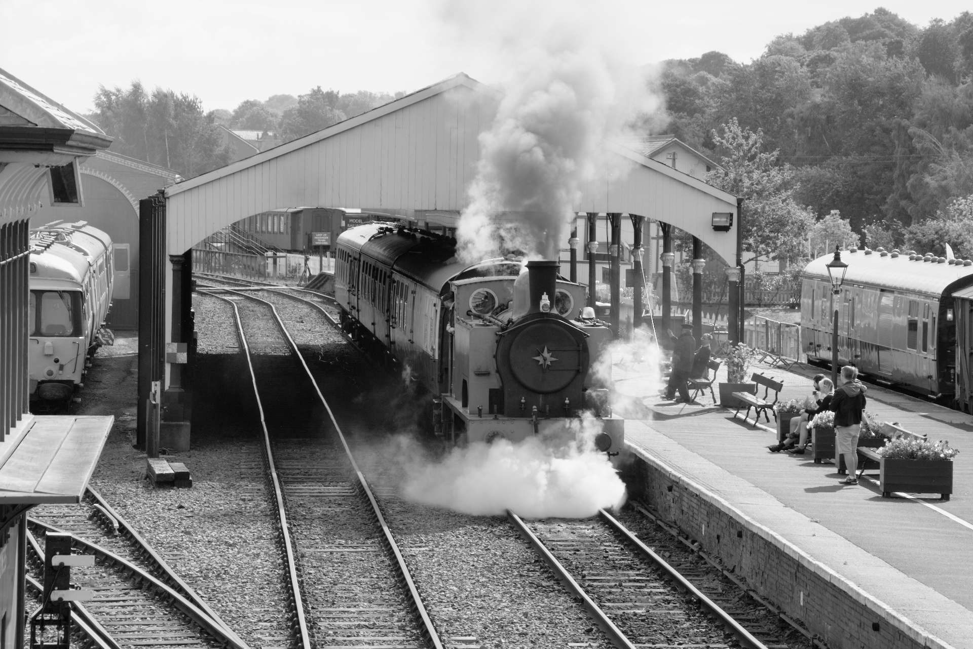 I also like the colour version, because the only substantial areas of saturated colour focuses attention on the star of the show - the locomotive. The same crop to both images.