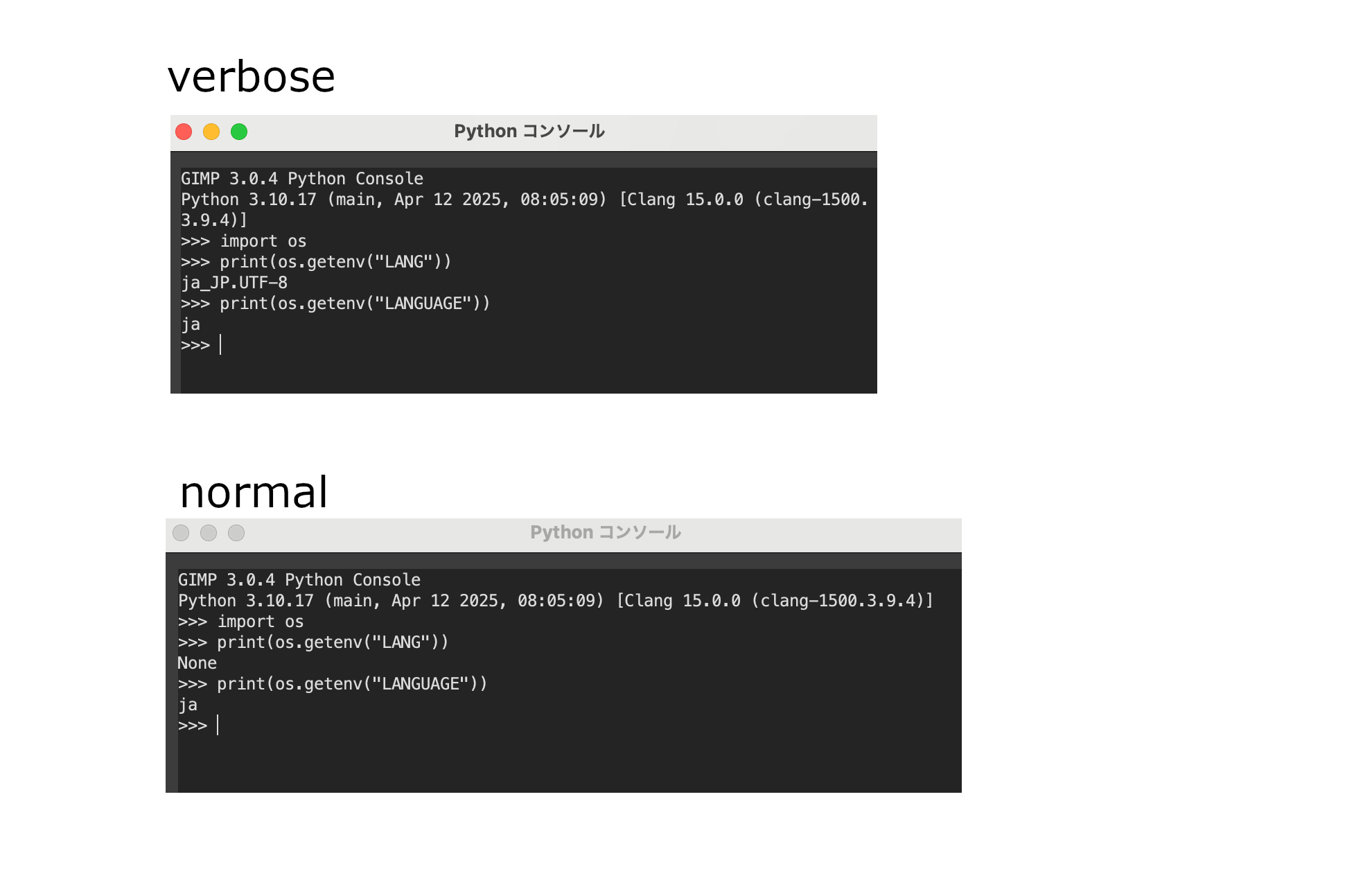 When I started GIMP in normal mode, the result of os.getenv(“LANG”) was None. However in verbose mode, the result is “ja-JP.UTF-8”.