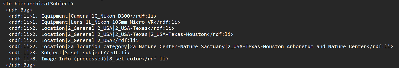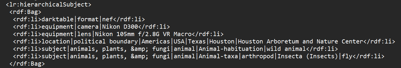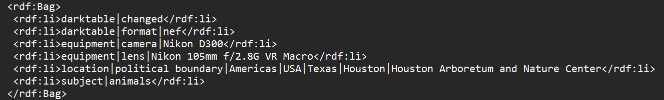 here is the same image’s tags and xmp file after removing from library, closing darktable (I have darktable look for updated xmp files on startup) and re adding to library: