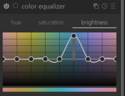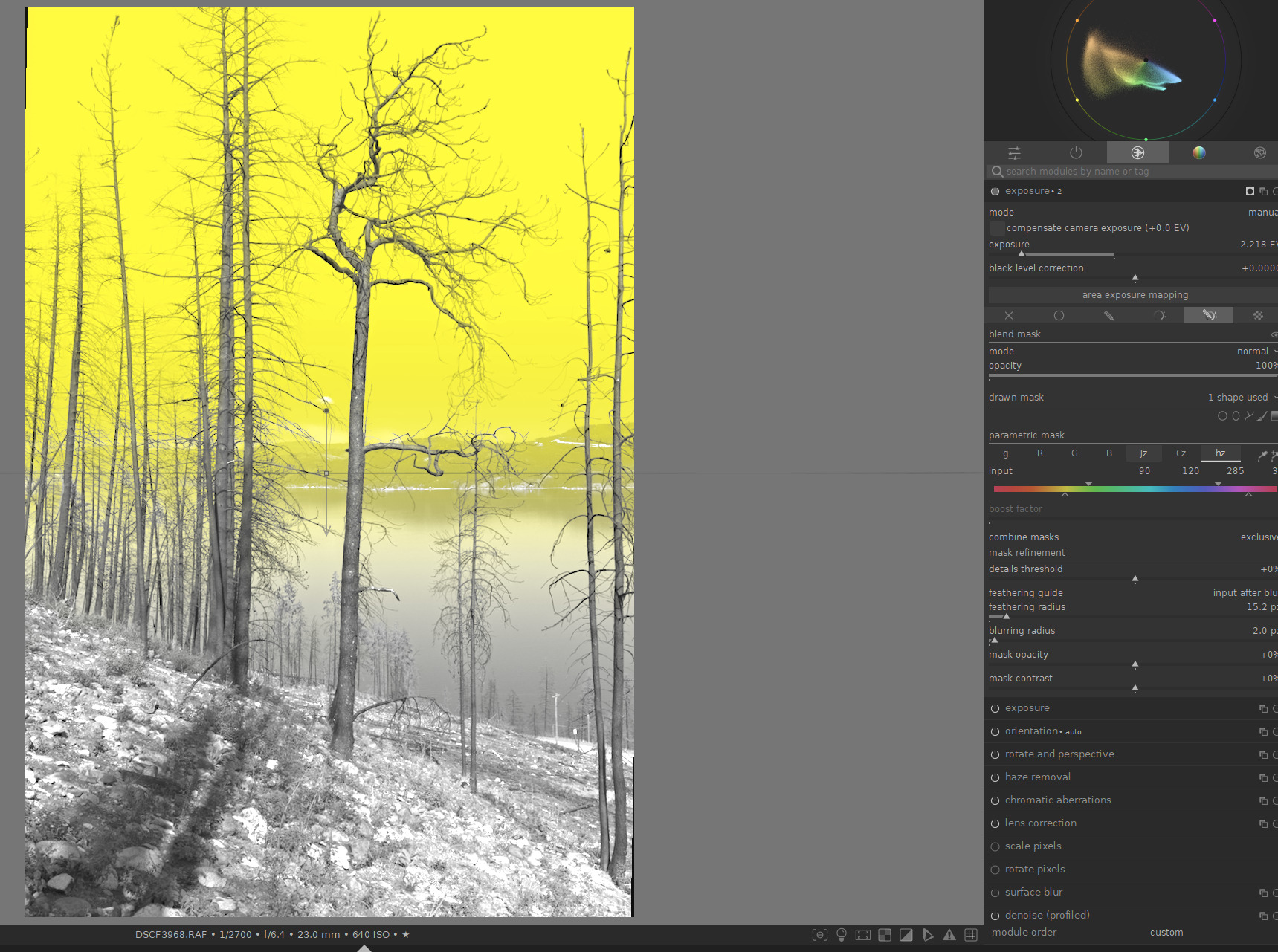 First, an instance of exposure with a drawn+parametric mask. First a gradient, then parametrically selected only blue-green and a brightness range.